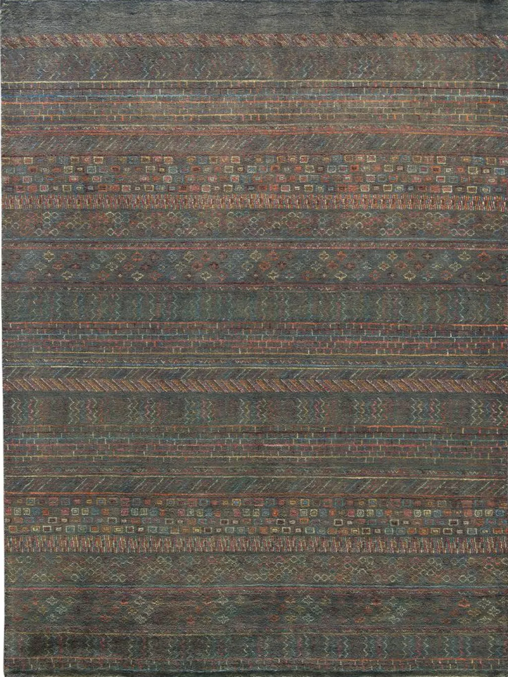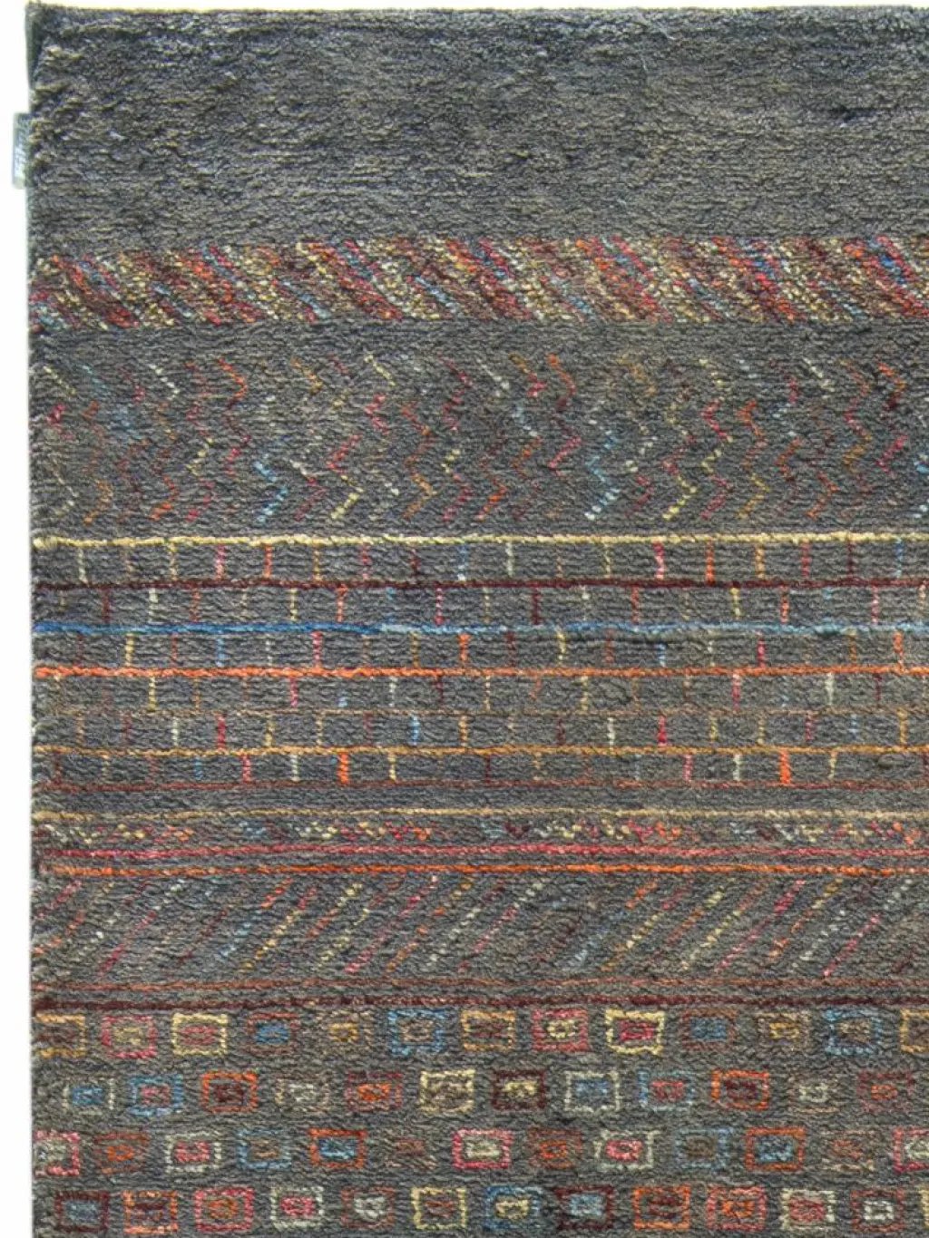 ist eine ungewöhnliche moderne Variation des traditionellen persichen Gabbehs. Er ist kürzer im Flor und feiner geknüpft. Es gibt zahllose Neukreationen in individuellen und einzigartigen Farben und Mustern.| Gesamthöhe: | ca. 8 mm |