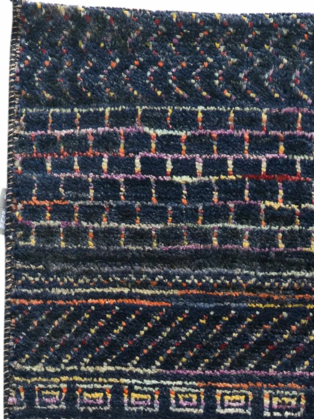 ist eine ungewöhnliche moderne Variation des traditionellen persichen Gabbehs. Er ist kürzer im Flor und feiner geknüpft. Es gibt zahllose Neukreationen in individuellen und einzigartigen Farben und Mustern.| Gesamthöhe: | ca. 10 mm |