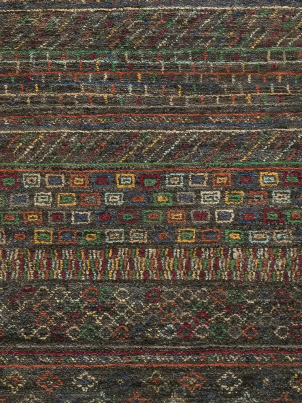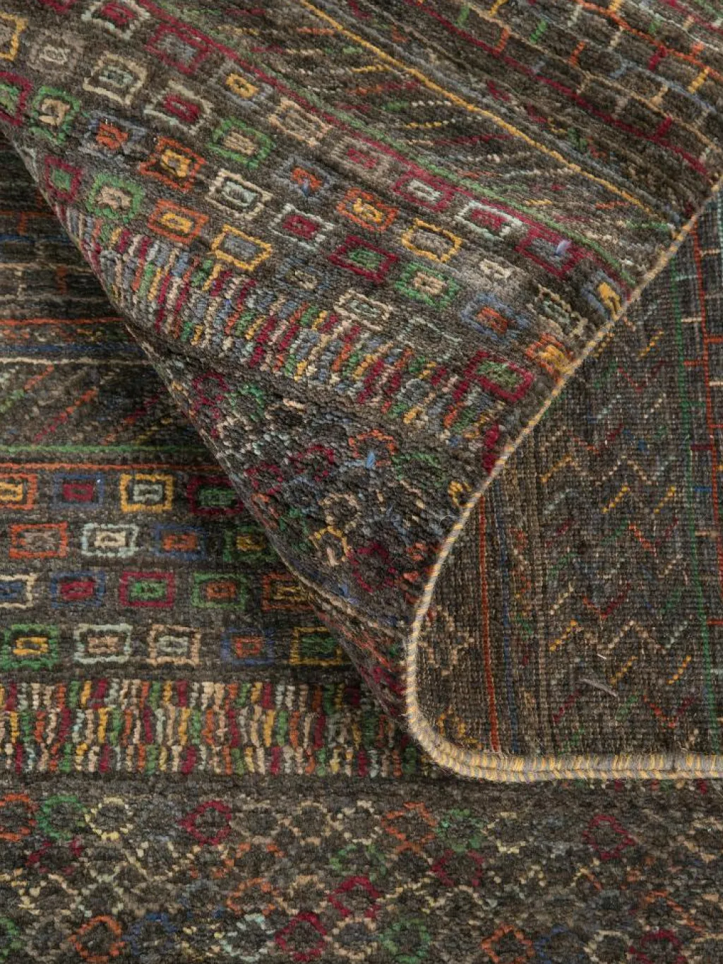 ist eine ungewöhnliche moderne Variation des traditionellen persichen Gabbehs. Er ist kürzer im Flor und feiner geknüpft. Es gibt zahllose Neukreationen in individuellen und einzigartigen Farben und Mustern.| Gesamthöhe: | ca. 7 mm |