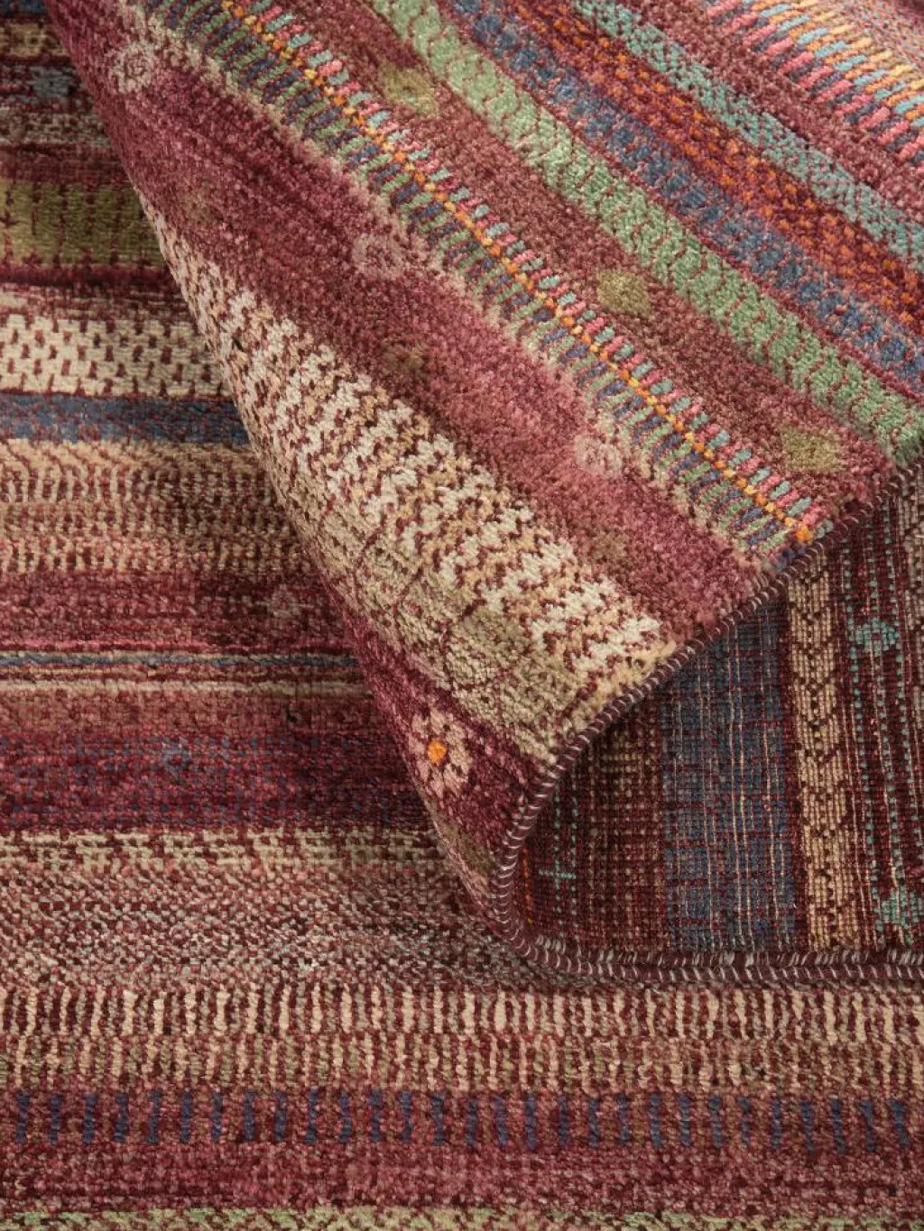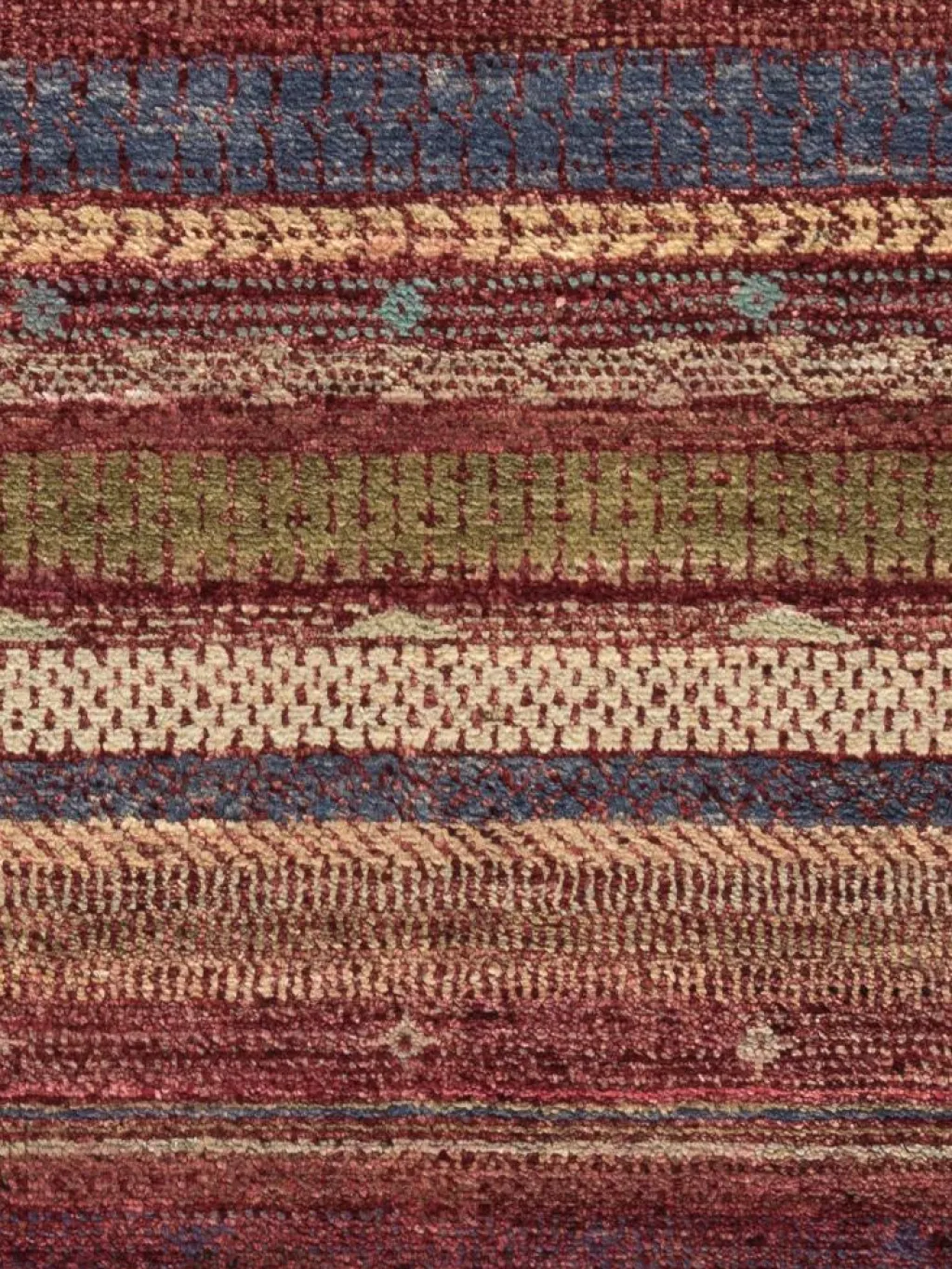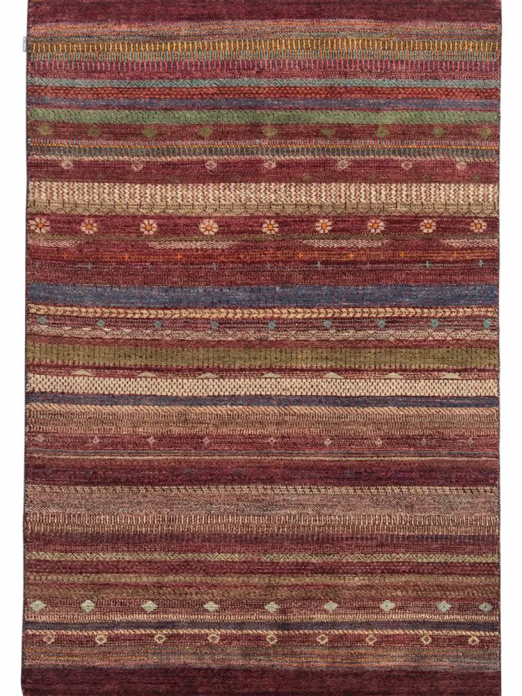 ist eine ungewöhnliche moderne Variation des traditionellen persichen Gabbehs. Er ist kürzer im Flor und feiner geknüpft. Es gibt zahllose Neukreationen in individuellen und einzigartigen Farben und Mustern.| Gesamthöhe: | ca. 7 mm |