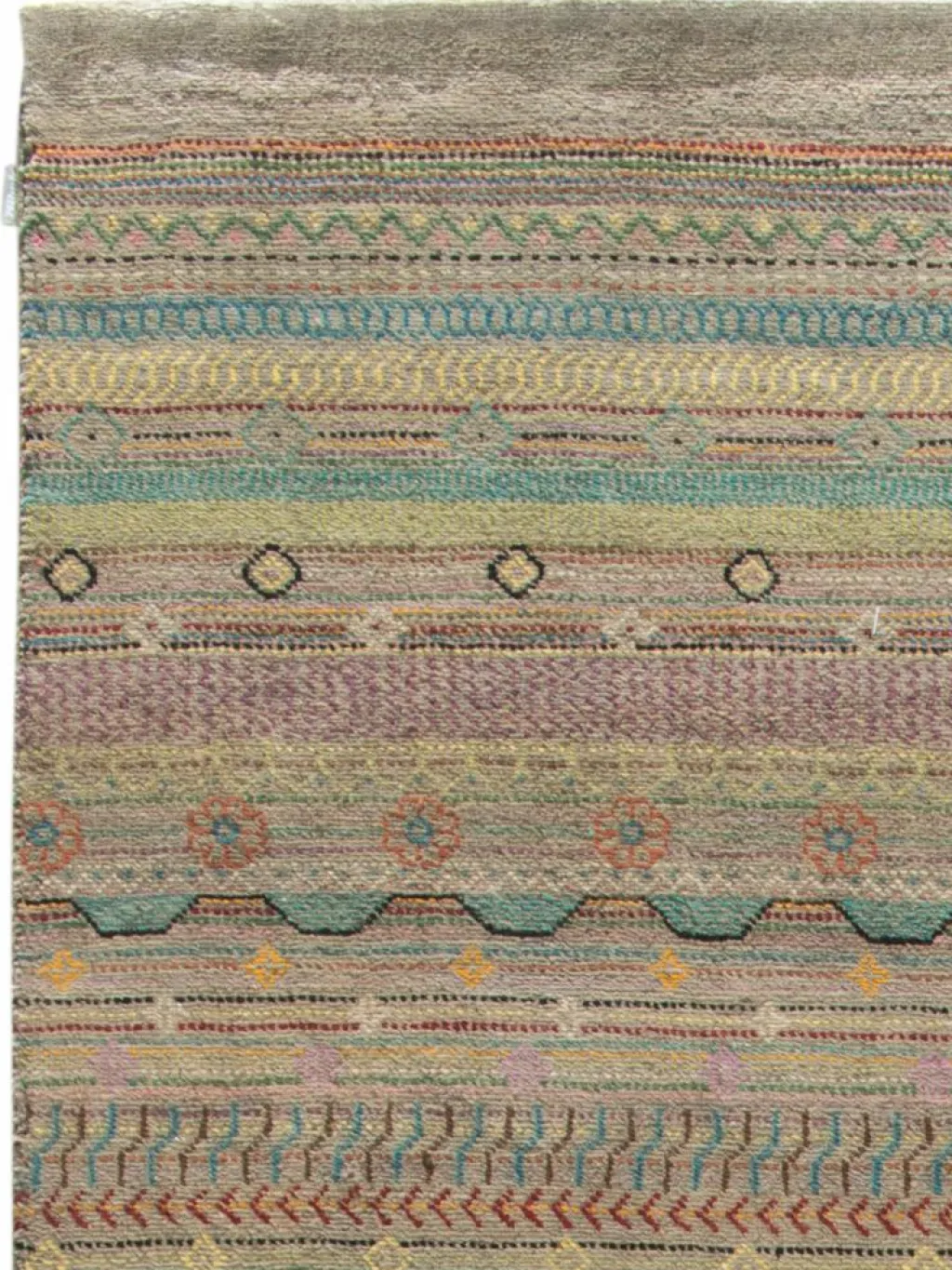 ist eine ungewöhnliche moderne Variation des traditionellen persichen Gabbehs. Er ist kürzer im Flor und feiner geknüpft. Es gibt zahllose Neukreationen in individuellen und einzigartigen Farben und Mustern.| Gesamthöhe: | ca. 10 mm |
