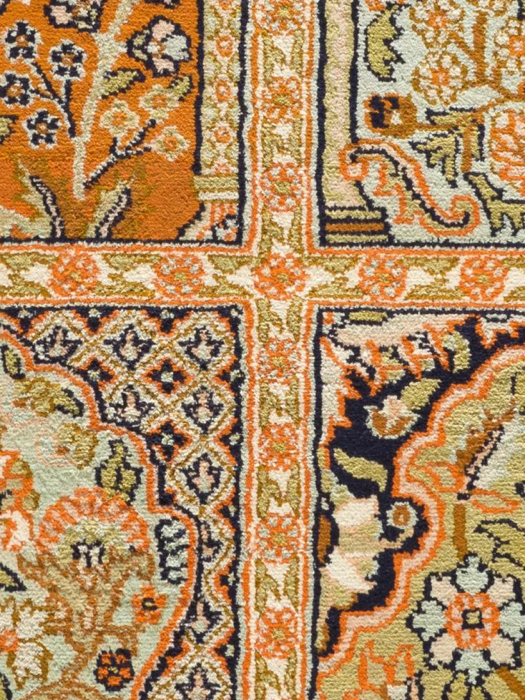 -Teppiche sind eher zurückhaltend, die Muster nach wie vor sehr stark persisch beeinflusst. Florale Motive und das persischeFeldermuster