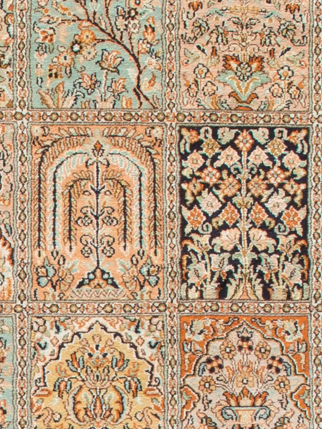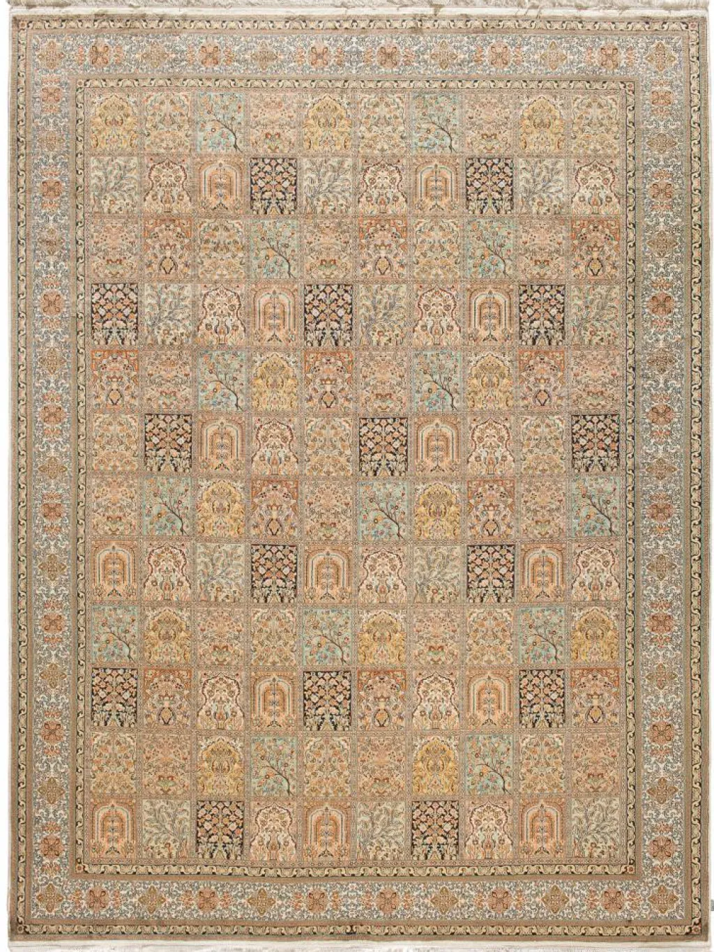 -Teppiche sind eher zurückhaltend, die Muster nach wie vor sehr stark persisch beeinflusst. Florale Motive und das persischeFeldermuster