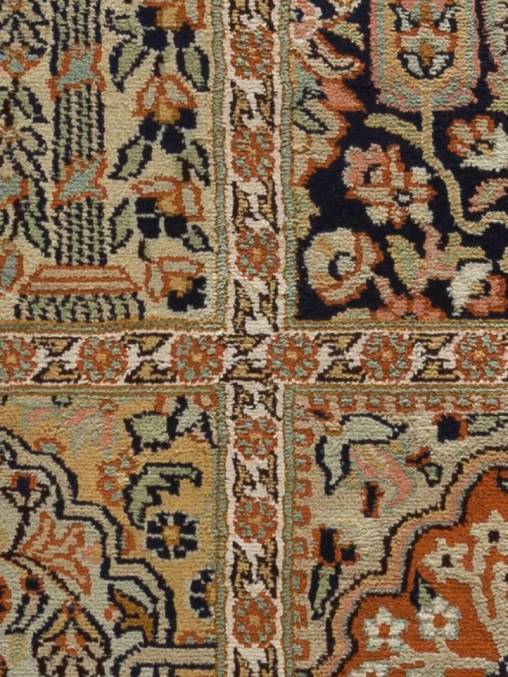 -Teppiche sind eher zurückhaltend, die Muster nach wie vor sehr stark persisch beeinflusst. Florale Motive und das persischeFeldermuster