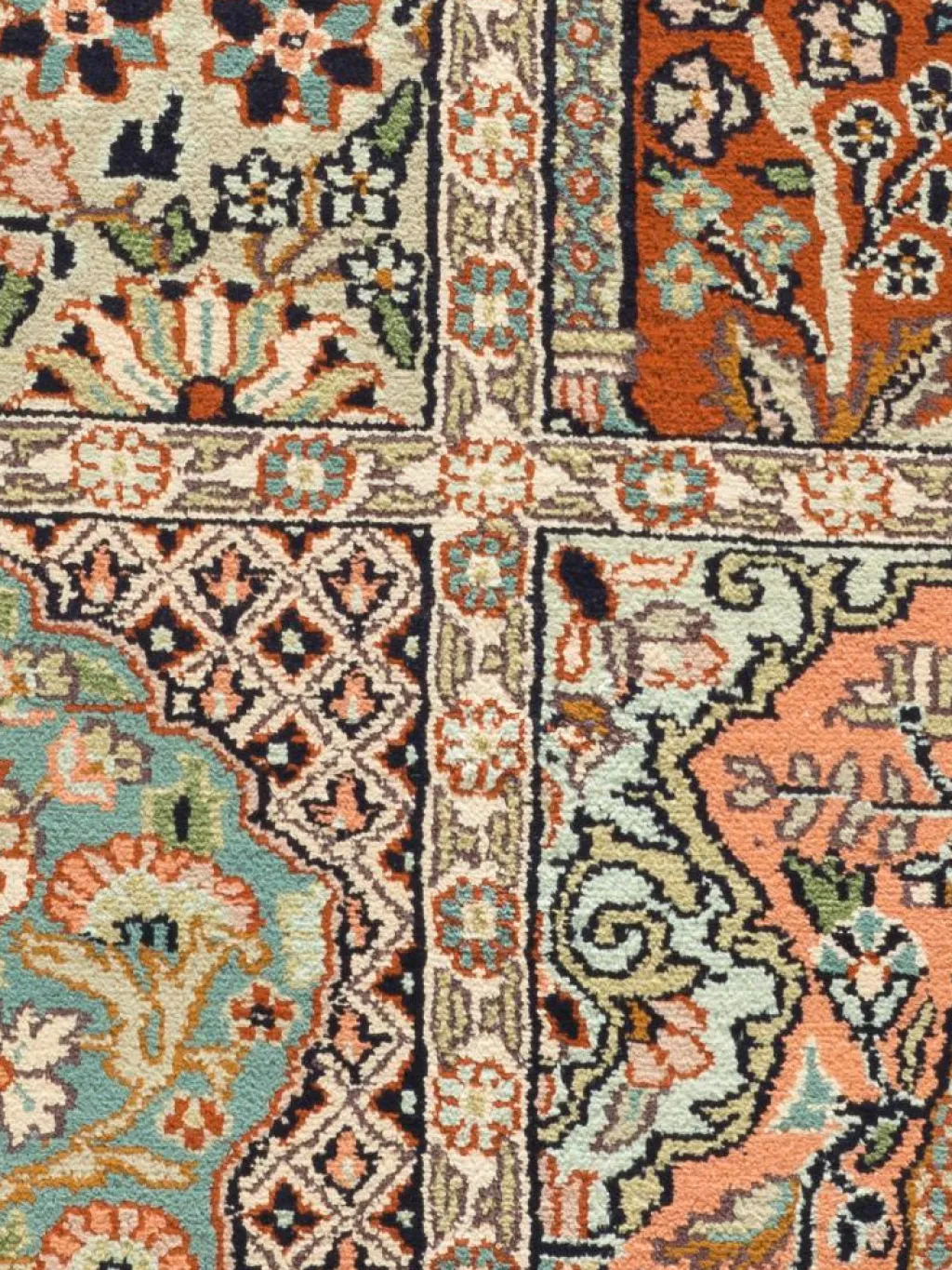 -Teppiche sind eher zurückhaltend, die Muster nach wie vor sehr stark persisch beeinflusst. Florale Motive und das persischeFeldermuster