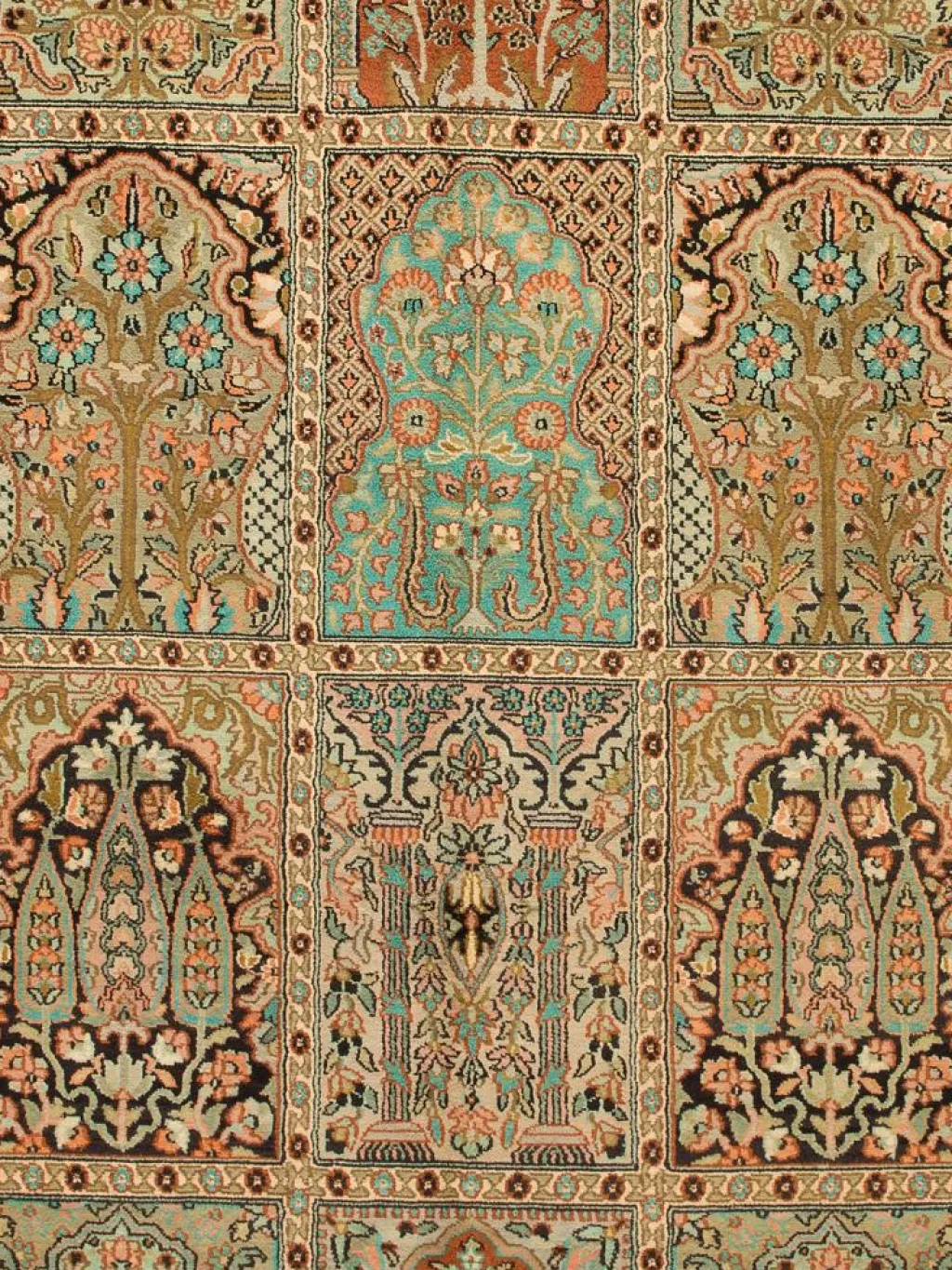 -Teppiche sind eher zurückhaltend, die Muster nach wie vor sehr stark persisch beeinflusst. Florale Motive und das persischeFeldermuster