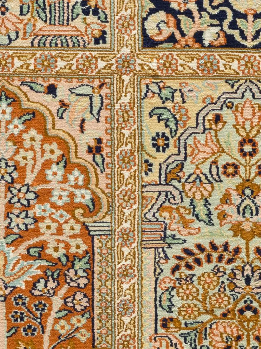 -Teppiche sind eher zurückhaltend, die Muster nach wie vor sehr stark persisch beeinflusst. Florale Motive und das persischeFeldermuster