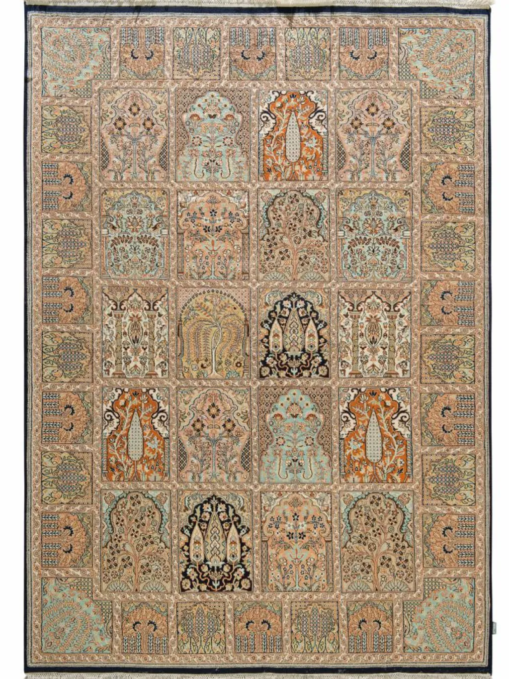 -Teppiche sind eher zurückhaltend, die Muster nach wie vor sehr stark persisch beeinflusst. Florale Motive und das persischeFeldermuster