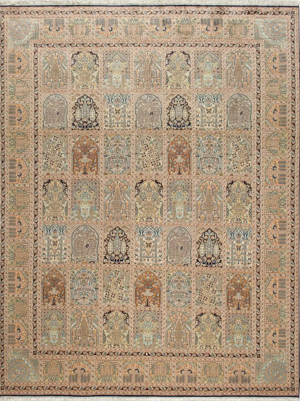 -Teppiche sind eher zurückhaltend, die Muster nach wie vor sehr stark persisch beeinflusst. Florale Motive und das persischeFeldermuster