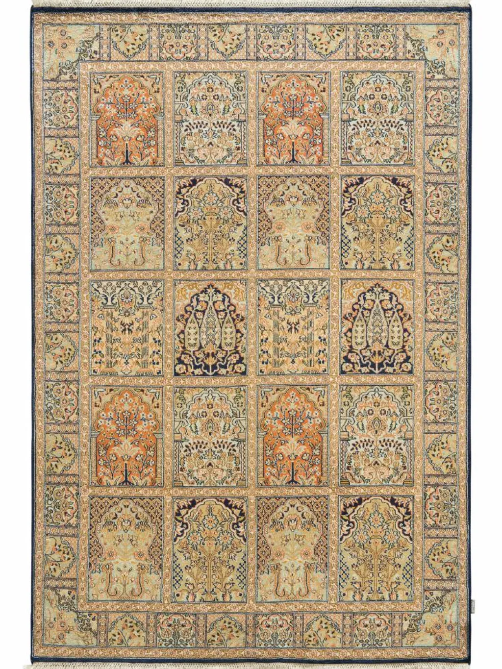 -Teppiche sind eher zurückhaltend, die Muster nach wie vor sehr stark persisch beeinflusst. Florale Motive und das persischeFeldermuster