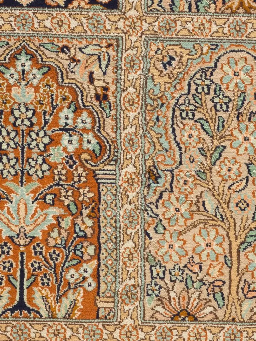 -Teppiche sind eher zurückhaltend, die Muster nach wie vor sehr stark persisch beeinflusst. Florale Motive und das persischeFeldermuster