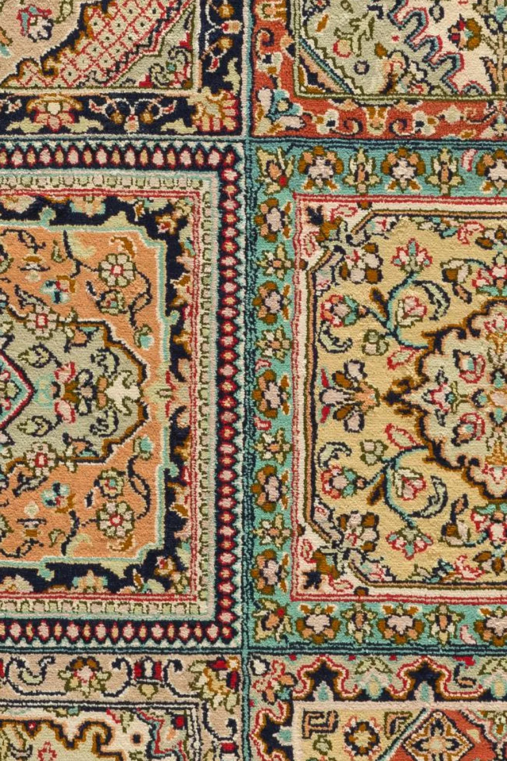 -Teppiche sind eher zurückhaltend, die Muster nach wie vor sehr stark persisch beeinflusst. Florale Motive und das persischeFeldermuster