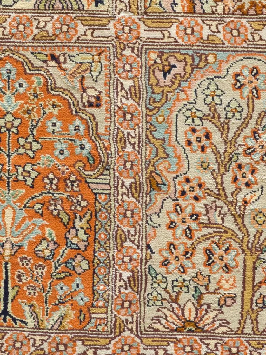 -Teppiche sind eher zurückhaltend, die Muster nach wie vor sehr stark persisch beeinflusst. Florale Motive und das persischeFeldermuster