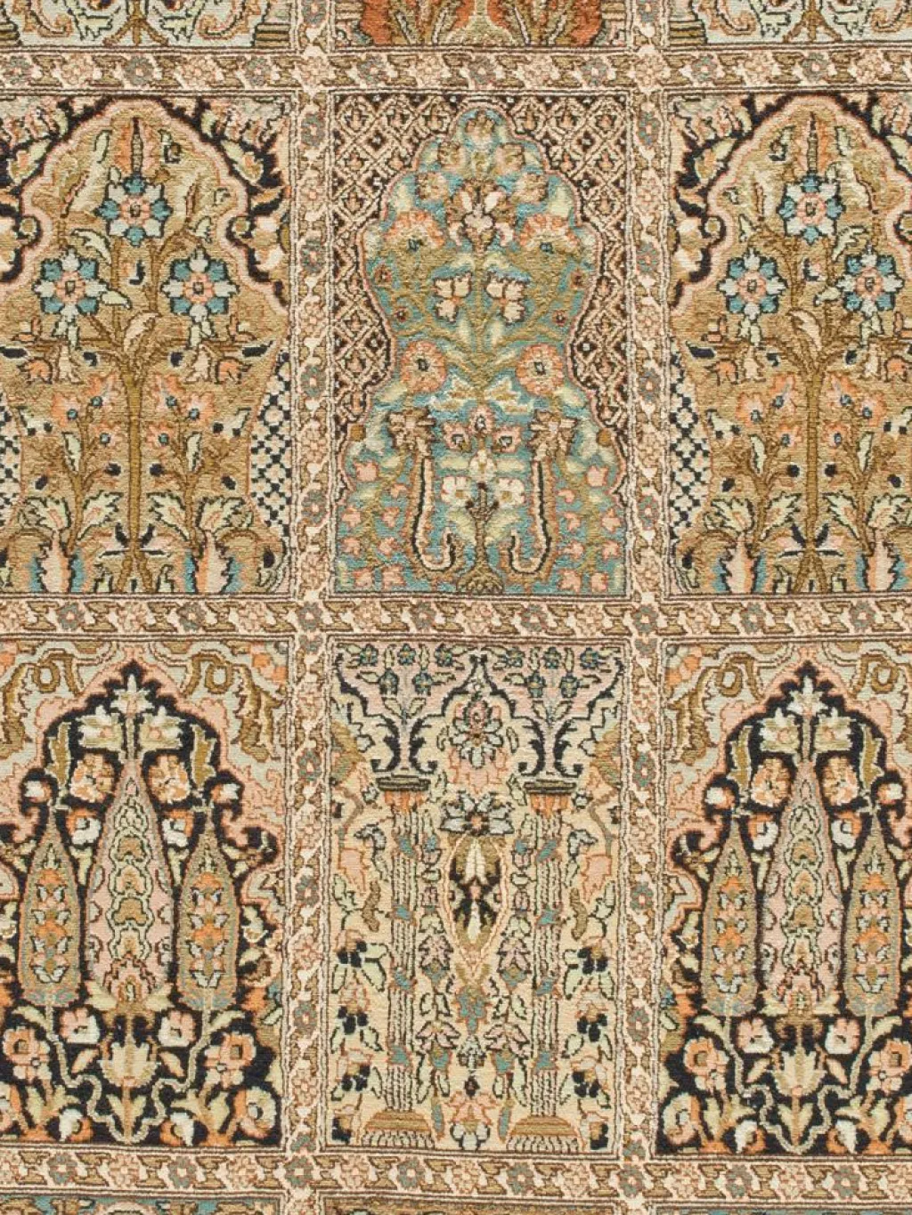 -Teppiche sind eher zurückhaltend, die Muster nach wie vor sehr stark persisch beeinflusst. Florale Motive und das persischeFeldermuster