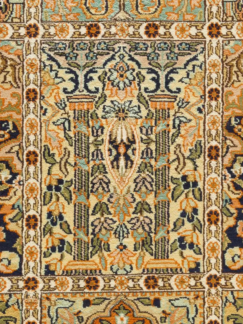-Teppiche sind eher zurückhaltend, die Muster nach wie vor sehr stark persisch beeinflusst. Florale Motive und das persischeFeldermuster