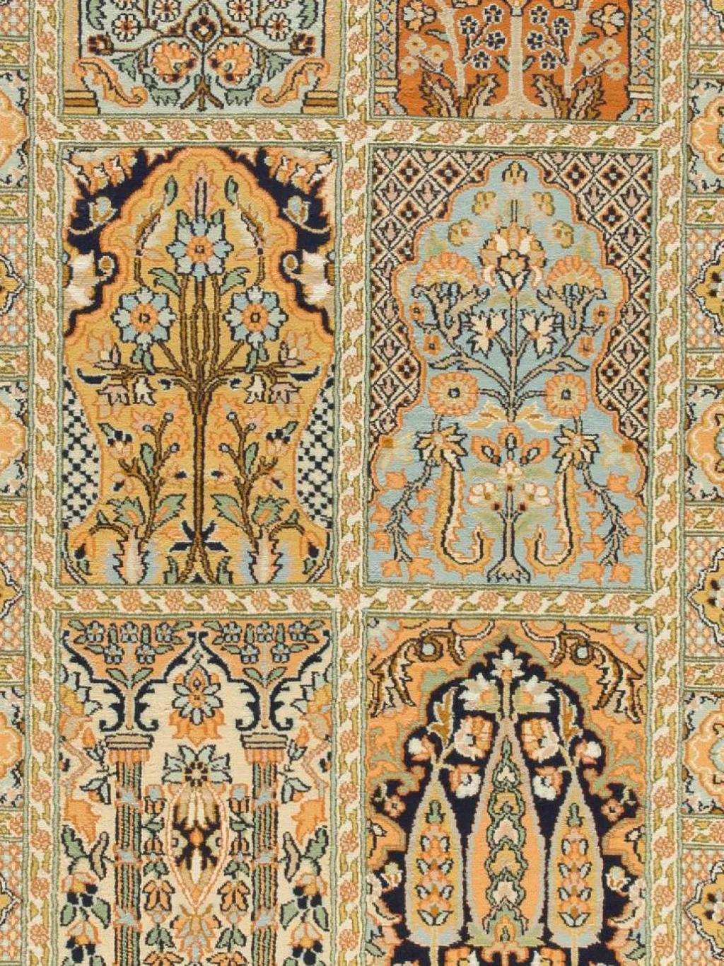 -Teppiche sind eher zurückhaltend, die Muster nach wie vor sehr stark persisch beeinflusst. Florale Motive und das persischeFeldermuster