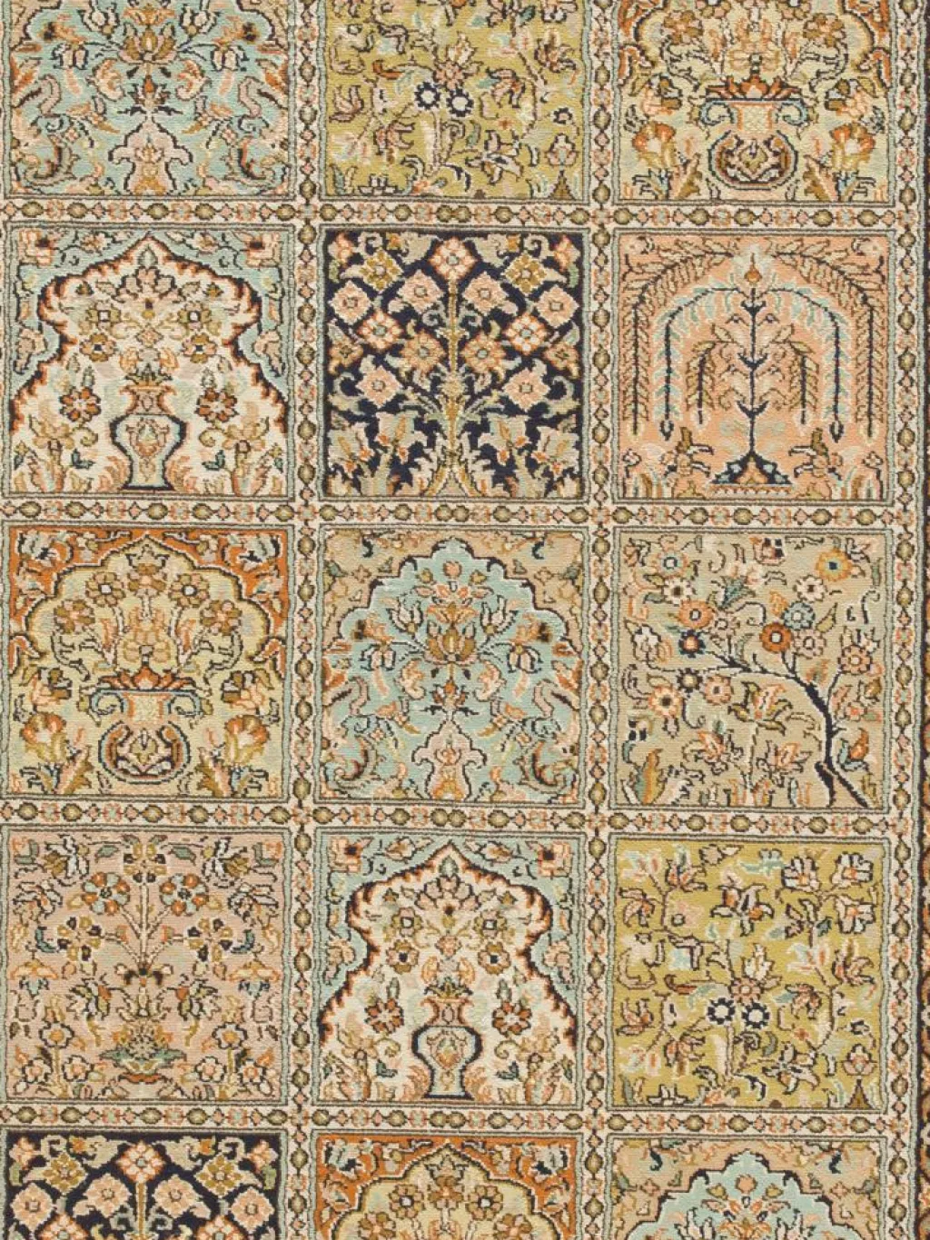 -Teppiche sind eher zurückhaltend, die Muster nach wie vor sehr stark persisch beeinflusst. Florale Motive und das persischeFeldermuster