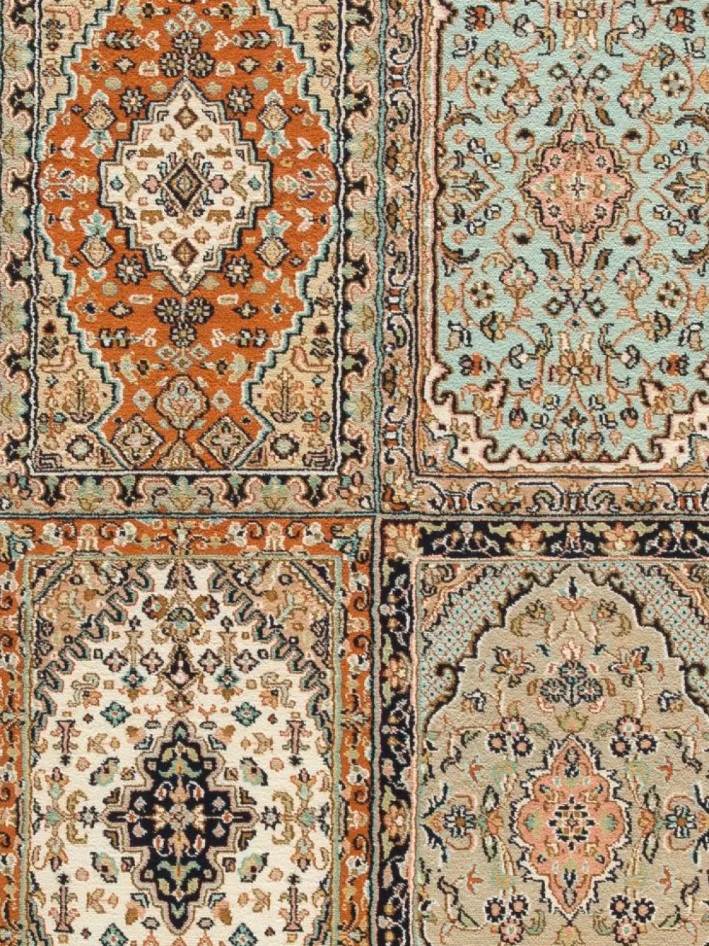 -Teppiche sind eher zurückhaltend, die Muster nach wie vor sehr stark persisch beeinflusst. Florale Motive und das persischeFeldermuster
