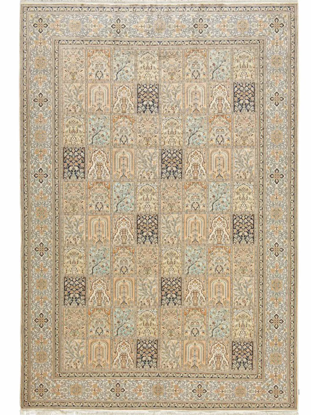 -Teppiche sind eher zurückhaltend, die Muster nach wie vor sehr stark persisch beeinflusst. Florale Motive und das persischeFeldermuster