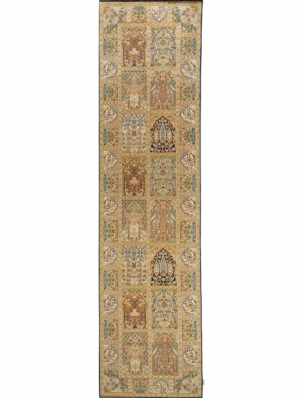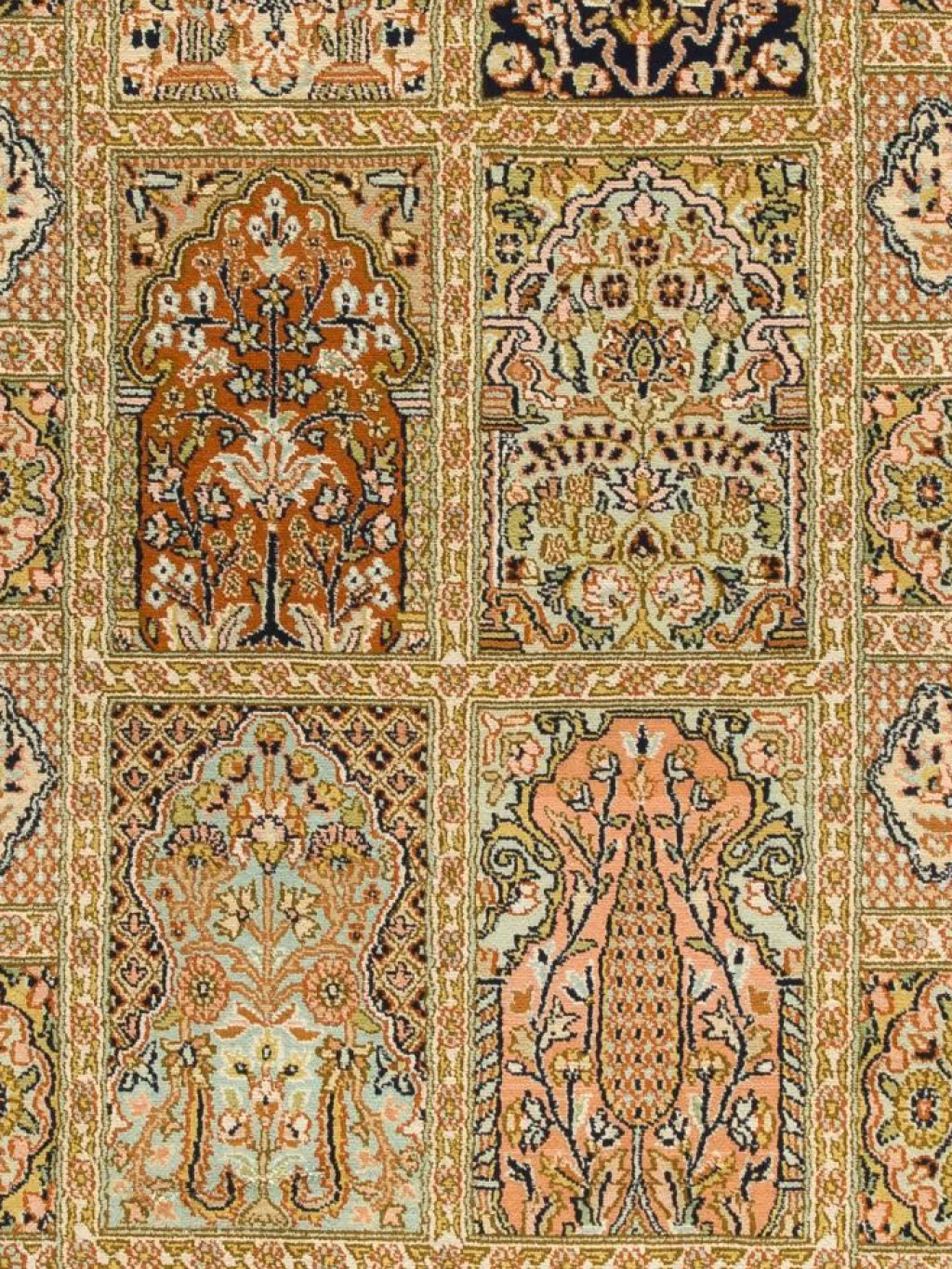 -Teppiche sind eher zurückhaltend, die Muster nach wie vor sehr stark persisch beeinflusst. Florale Motive und das persischeFeldermuster