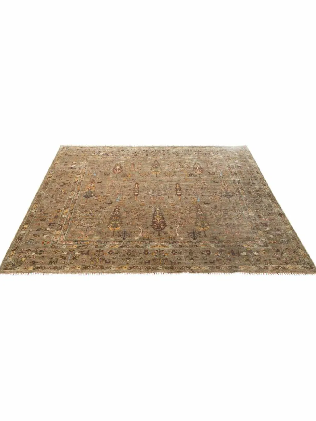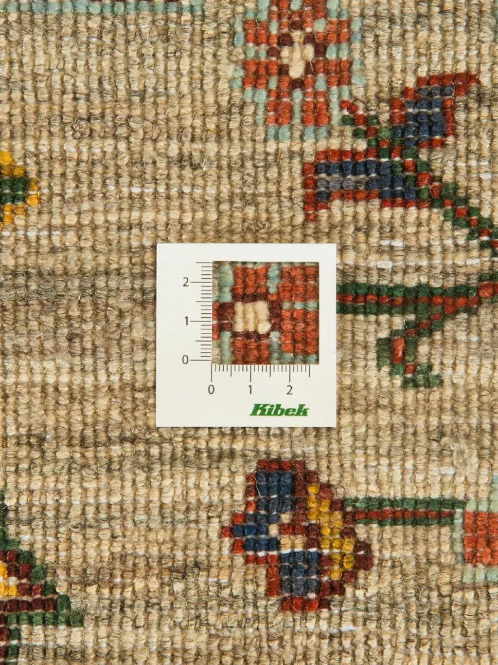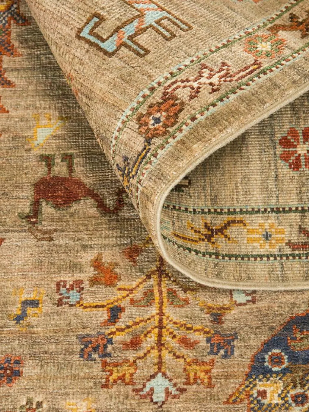mit Landschaftsmotiven im Stil kaukasischer Teppiche. Das Wort „Gayoon“ kommt aus der Pakistanischen Sprache Urdu und bedeutet „“Landschaft““ oder auch „“Garten““. Durch den flachen und festen Flor ist der Teppich unempfindlich gegenüber den Belastungen des Alltags. – Der Teppich wurde ausGhazni