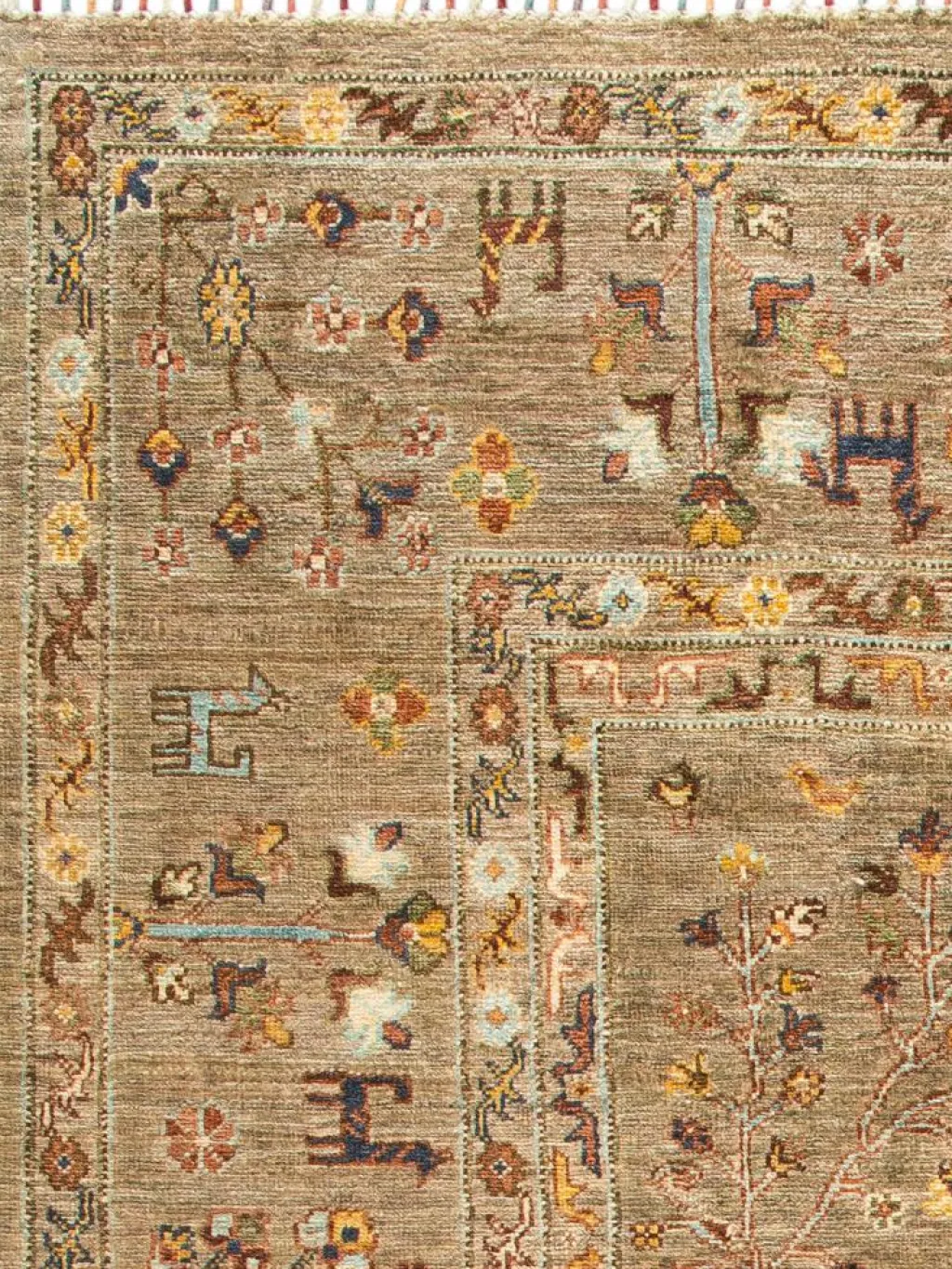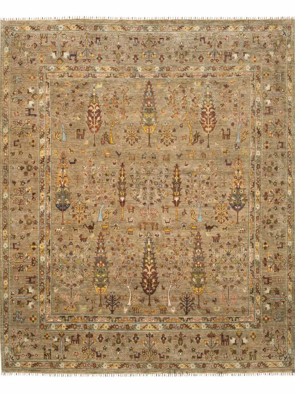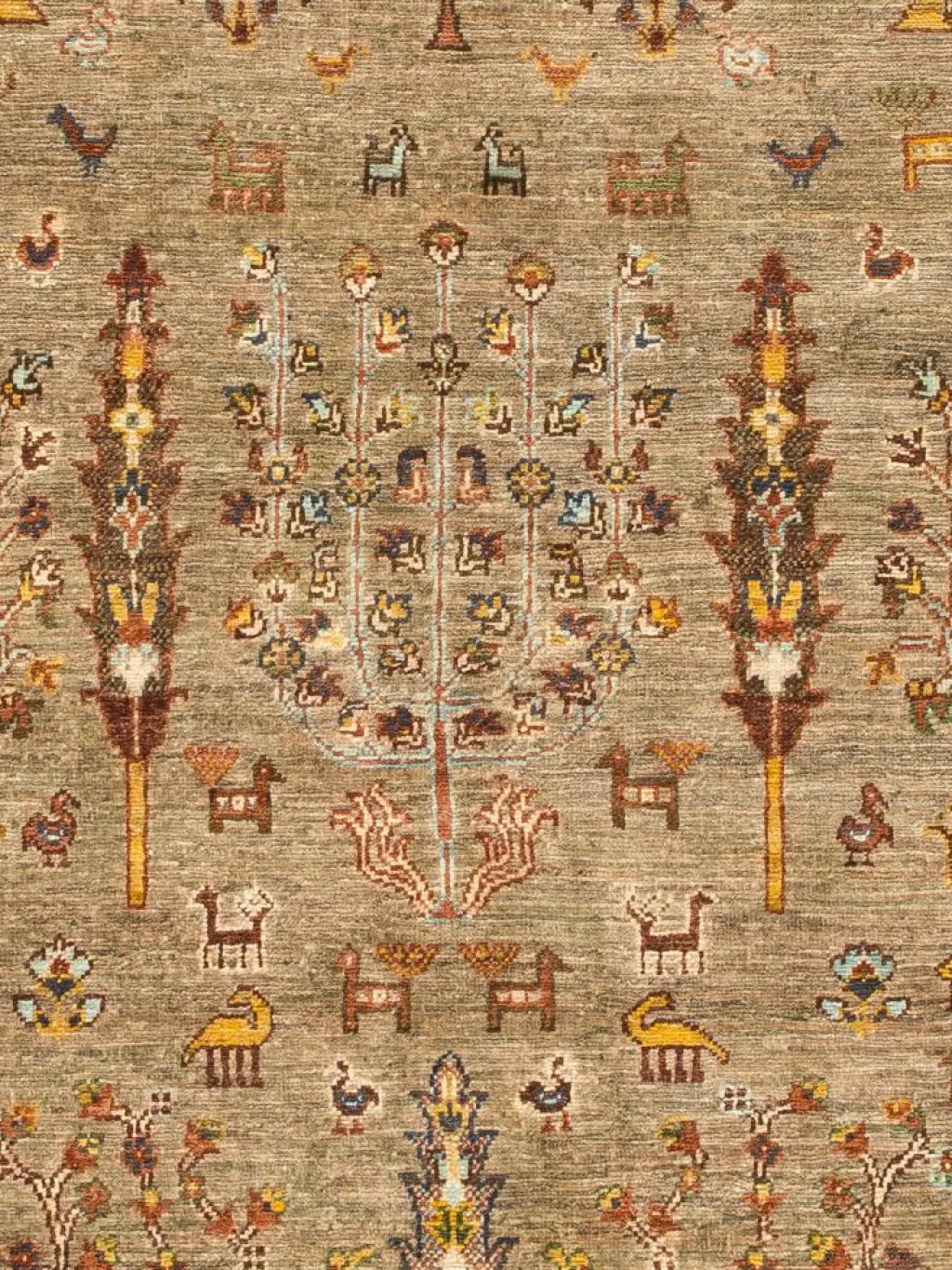 mit Landschaftsmotiven im Stil kaukasischer Teppiche. Das Wort „Gayoon“ kommt aus der Pakistanischen Sprache Urdu und bedeutet „“Landschaft““ oder auch „“Garten““. Durch den flachen und festen Flor ist der Teppich unempfindlich gegenüber den Belastungen des Alltags. – Der Teppich wurde ausGhazni