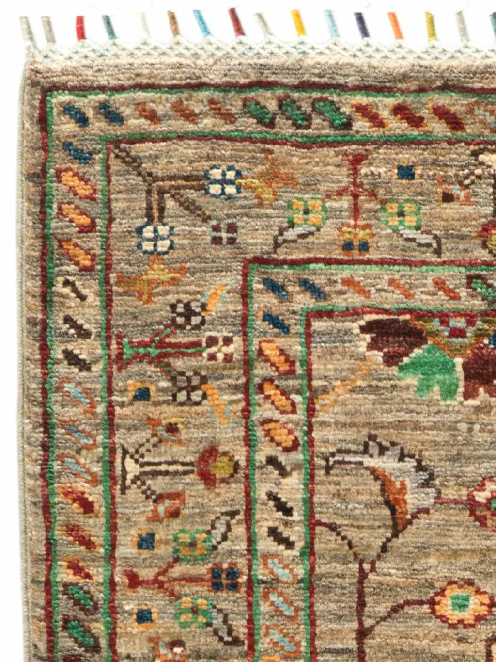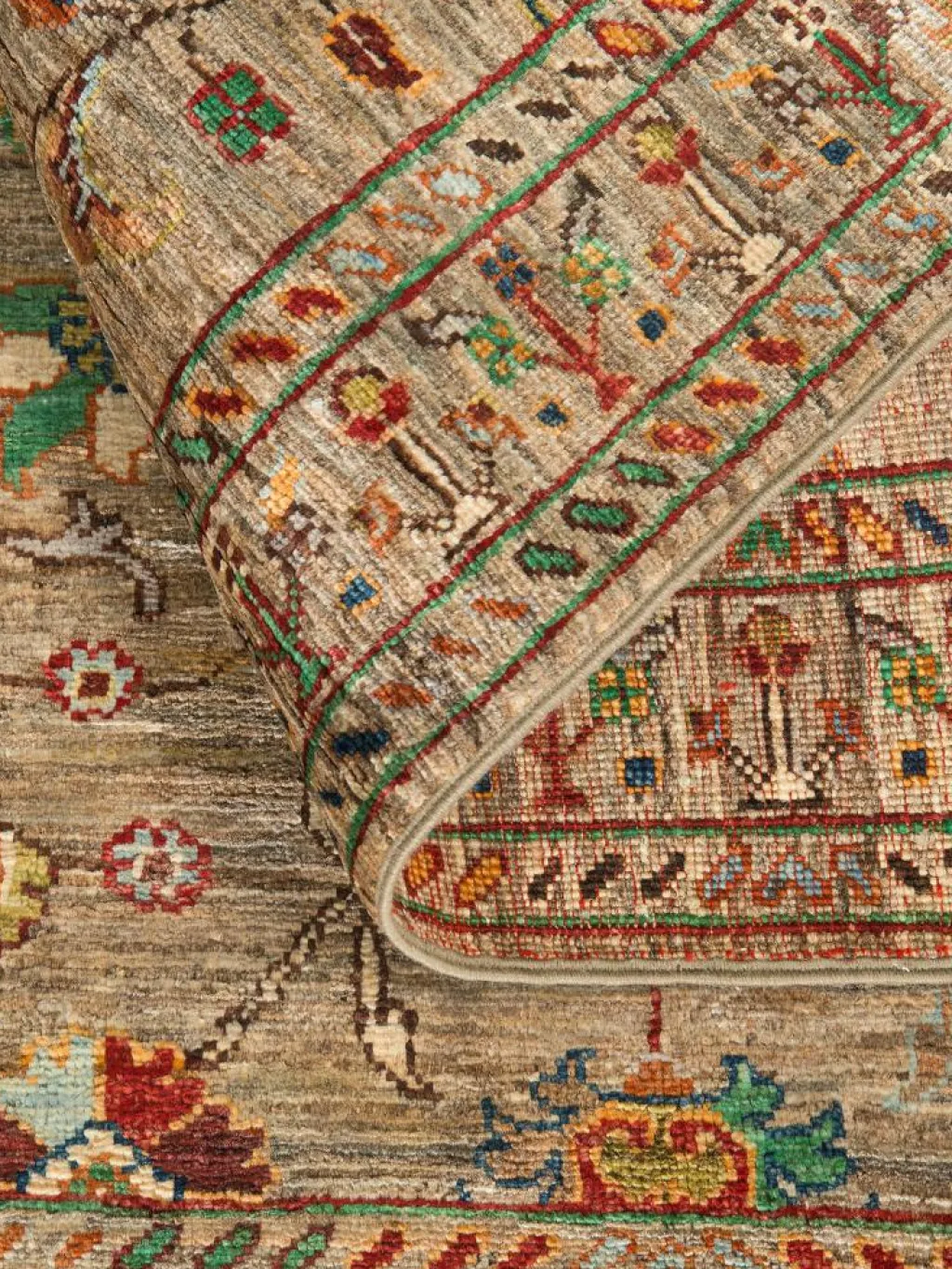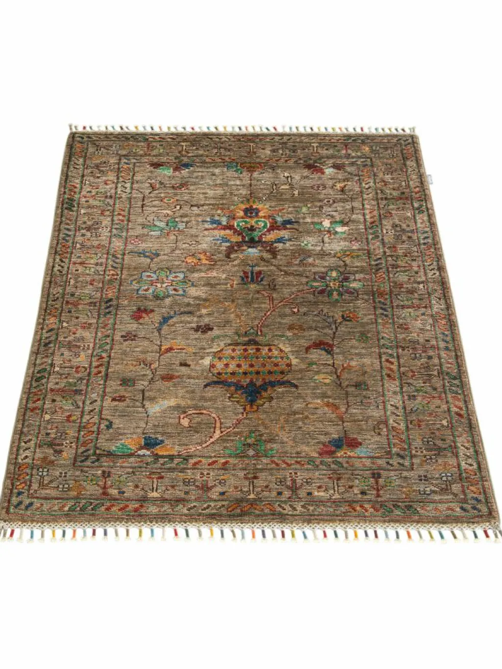 , einem klassischen Blütenmuster. Das Wort „Phool“ kommt aus der Pakistanischen Sprache Urdu und bedeutet „Blume“. Durch den flachen und festen Flor ist der Teppich unempfindlich gegenüber den Belastungen des Alltags. – Der Teppich wurde ausGhazni
