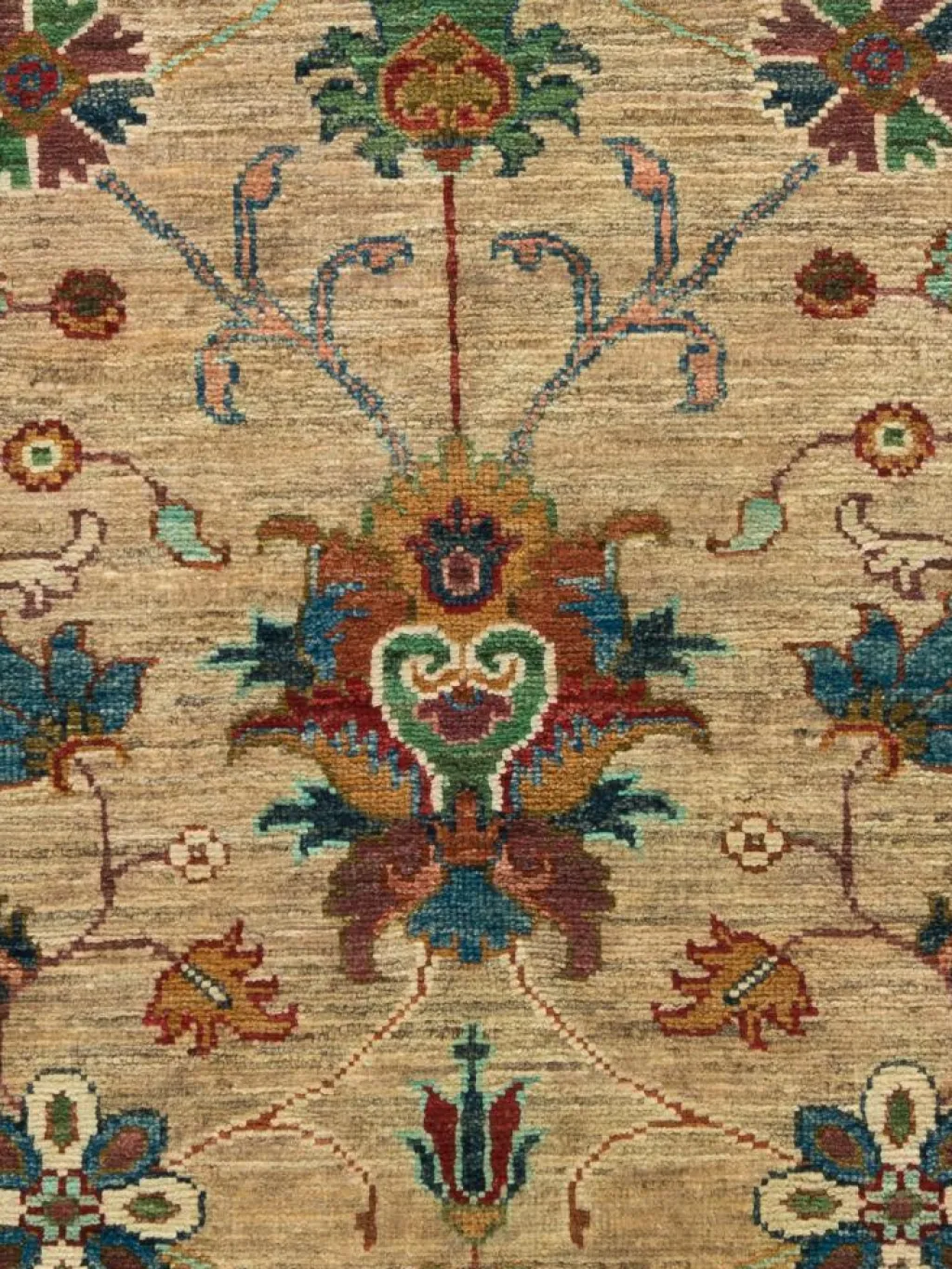 , einem klassischen Blütenmuster. Das Wort „Phool“ kommt aus der Pakistanischen Sprache Urdu und bedeutet „Blume“. Durch den flachen und festen Flor ist der Teppich unempfindlich gegenüber den Belastungen des Alltags. – Der Teppich wurde ausGhazni