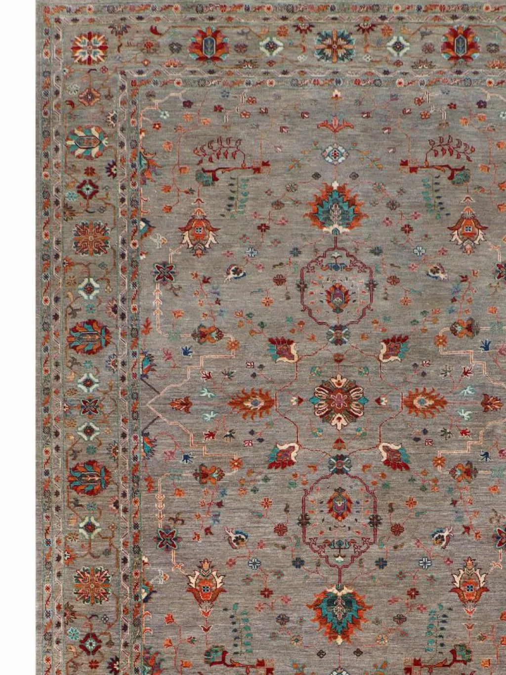 , einem klassischen Blütenmuster. Das Wort „Phool“ kommt aus der Pakistanischen Sprache Urdu und bedeutet „“Blume““. Durch den flachen und festen Flor ist der Teppich unempfindlich gegenüber den Belastungen des Alltags. – Der Teppich wurde ausGhazni