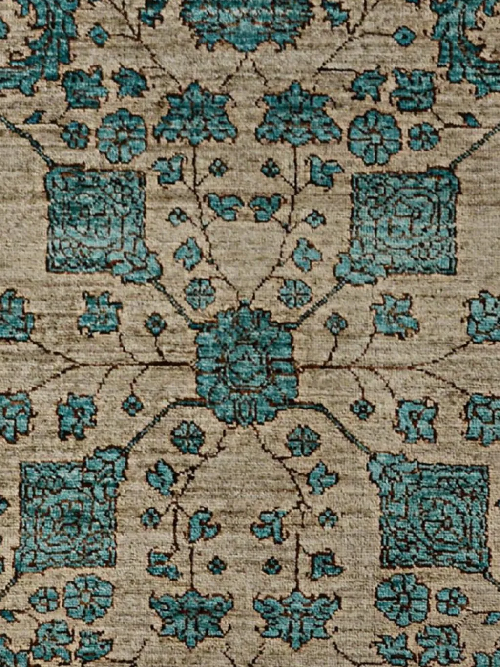 , einem klassischen Blütenmuster. Das Wort „Phool“ kommt aus der Pakistanischen Sprache Urdu und bedeutet „“Blume““. Durch den flachen und festen Flor ist der Teppich unempfindlich gegenüber den Belastungen des Alltags. – Der Teppich wurde ausGhazni