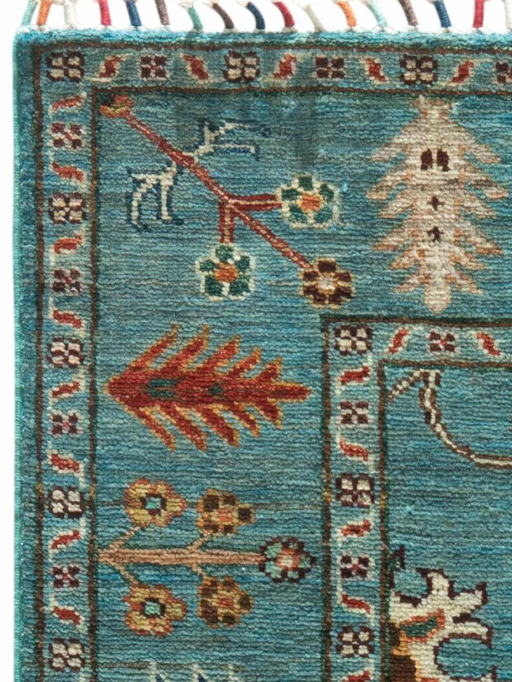 , einem klassischen Blütenmuster. Das Wort „Phool“ kommt aus der Pakistanischen Sprache Urdu und bedeutet „“Blume““. Durch den flachen und festen Flor ist der Teppich unempfindlich gegenüber den Belastungen des Alltags. – Der Teppich wurde ausGhazni