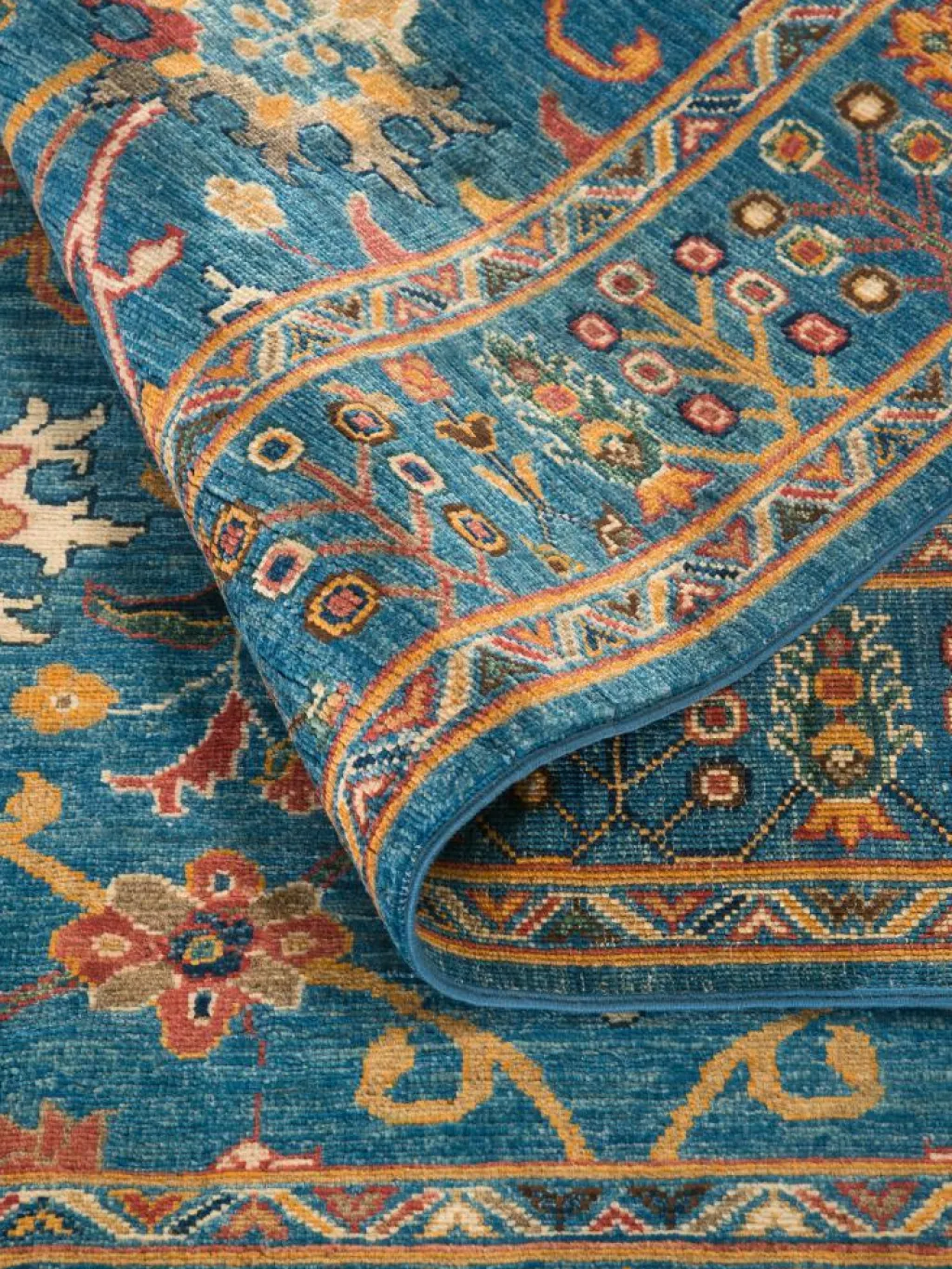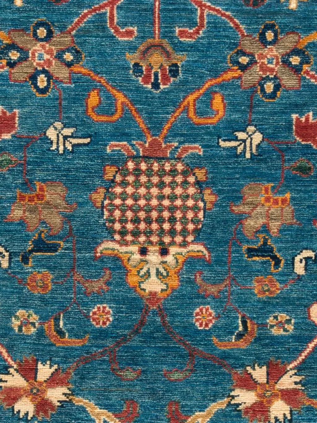 , einem klassischen Blütenmuster. Das Wort „Phool“ kommt aus der Pakistanischen Sprache Urdu und bedeutet „Blume“. Durch den flachen und festen Flor ist der Teppich unempfindlich gegenüber den Belastungen des Alltags. – Der Teppich wurde ausGhazni