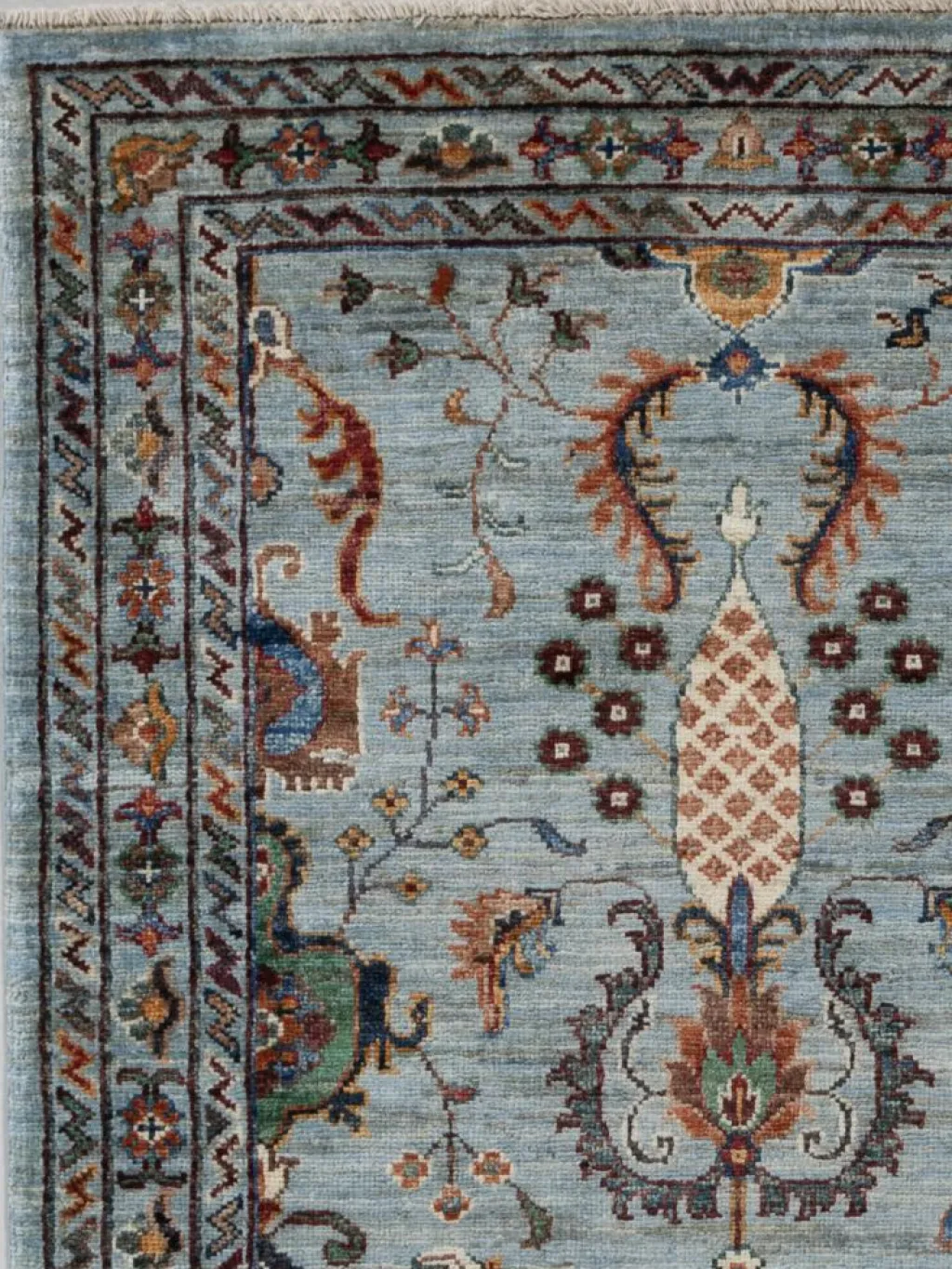 , einem klassischen Blütenmuster. Das Wort „Phool“ kommt aus der Pakistanischen Sprache Urdu und bedeutet „Blume“. Durch den flachen und festen Flor ist der Teppich unempfindlich gegenüber den Belastungen des Alltags. – Der Teppich wurde ausGhazni