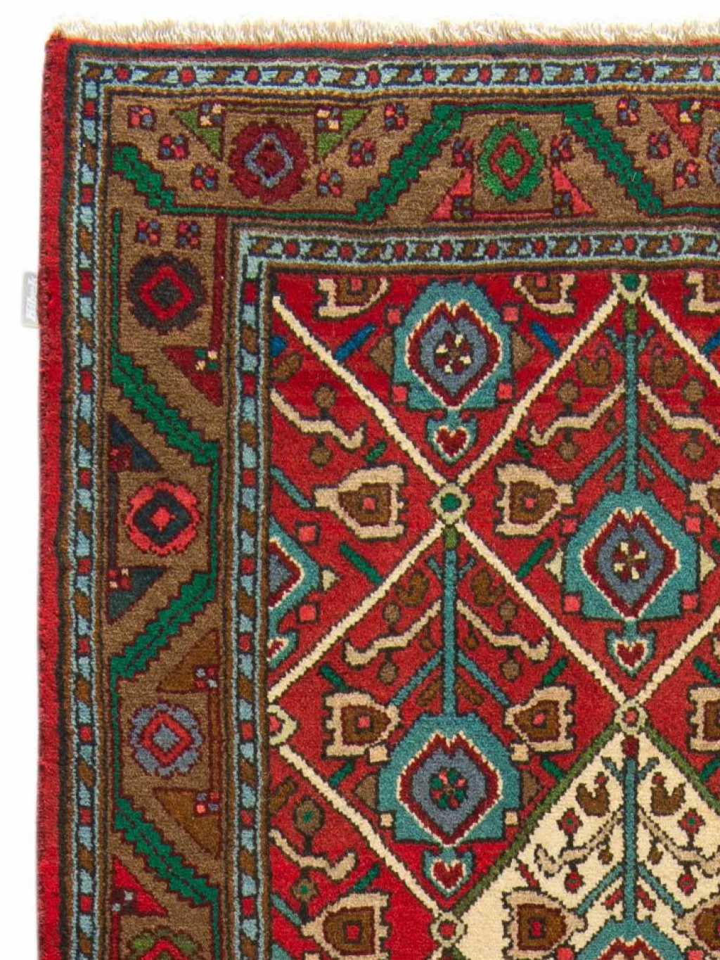 finden sich die unterschiedlichsten Dessins anderer Provenienzen, die in einer kurdentypischen Art und Weise, in völlig anderen Farben, geknüpft werden. Meist ist die Farbgebung der Teppiche eher dunkel. Der hohe Flor ist aus guter Bergschafwolle und besonders haltbar.| Gesamthöhe: | ca. 11 mm |