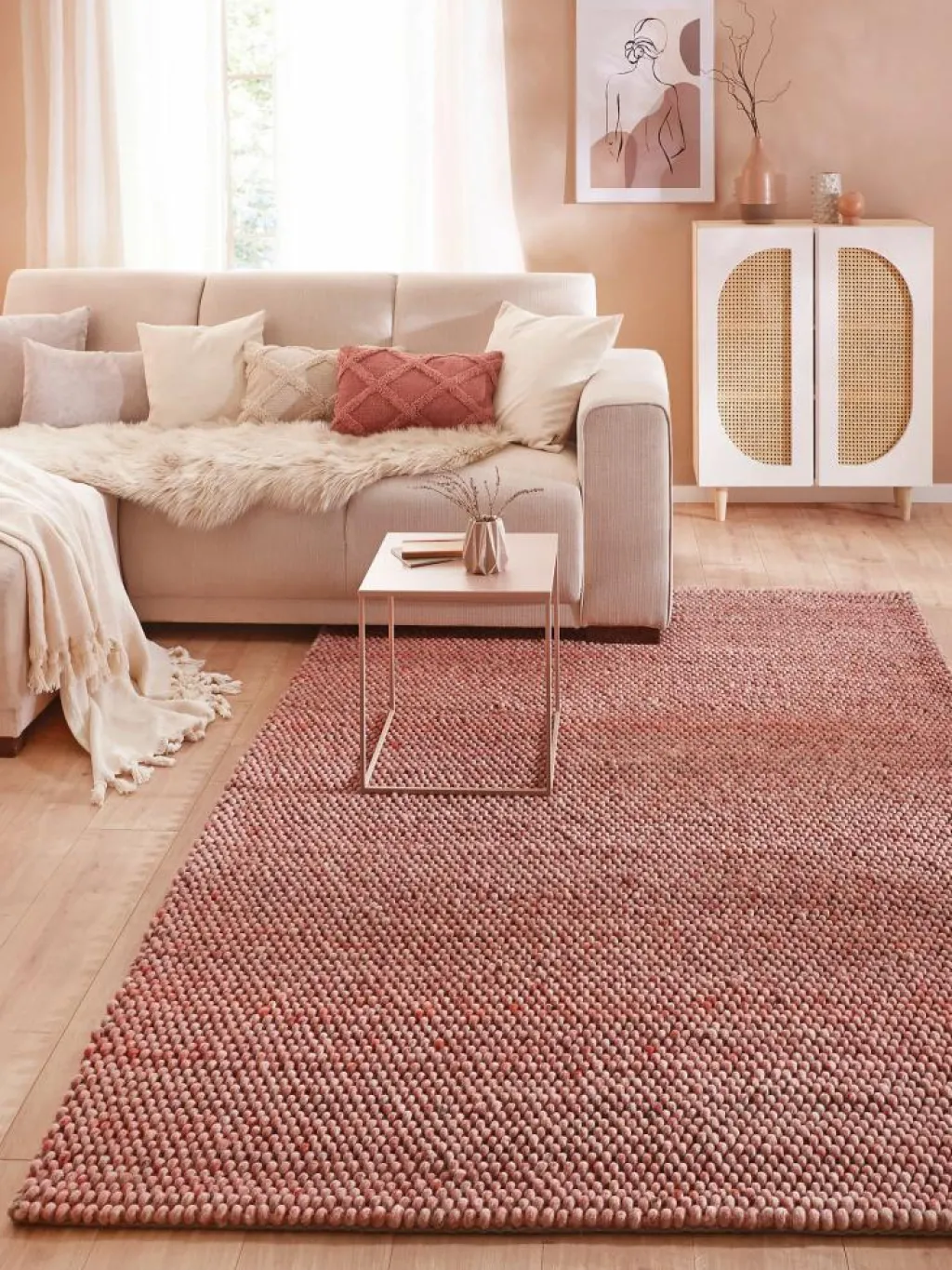wird eine Vielzahl von Filzkugeln gewalkt, die dann verwebt werden. Dadurch entsteht eine einzigartige Haptik und eine zeitlose Optik, die jeden Wohn- oder Schlafraum aufwertet. Gleichzeitig sorgt die verarbeiteteSchurwolle