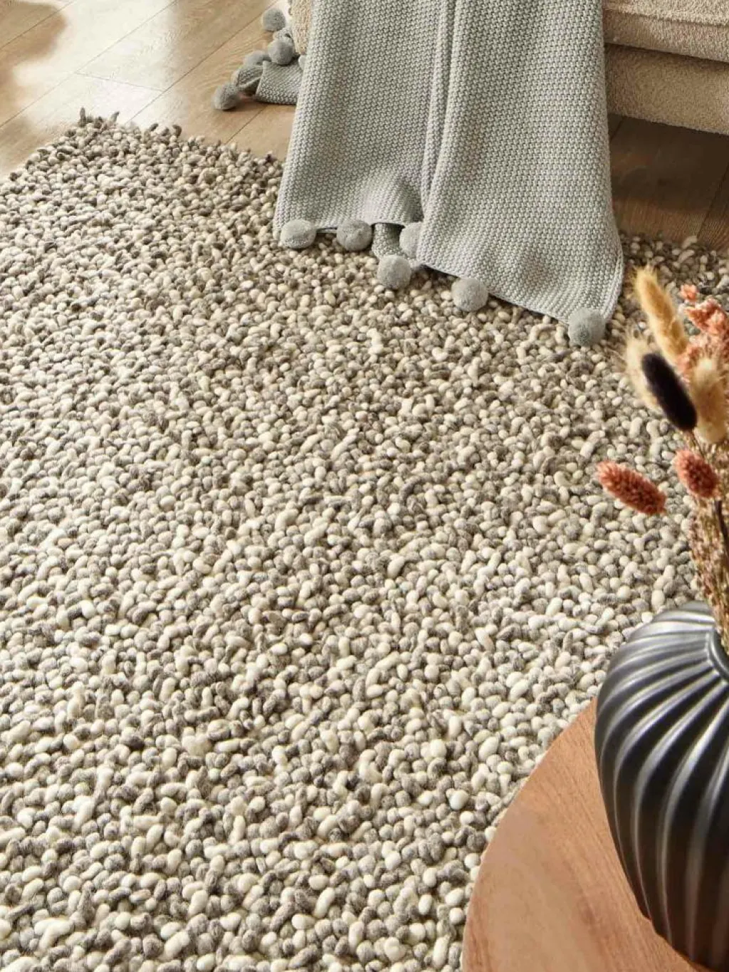 , die vornehmlich aus Neuseeland stammt,wird von Hand in den Teppichgrund des MELBU eingearbeitet. Das natürliche Farbspiel des Garn macht MELBU so einzigartig. DasGrundgewebe