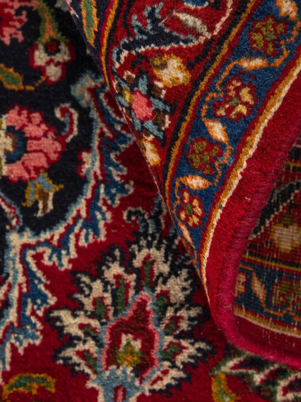 gehört zu den Hauptprovenienzen der persischen Orientteppiche.Typisch ist eine tiefrote Grundfarbe mit einer leichten Lilatönung und sehr feinen floralen Musterkompositionen mit Ranken undArabesken