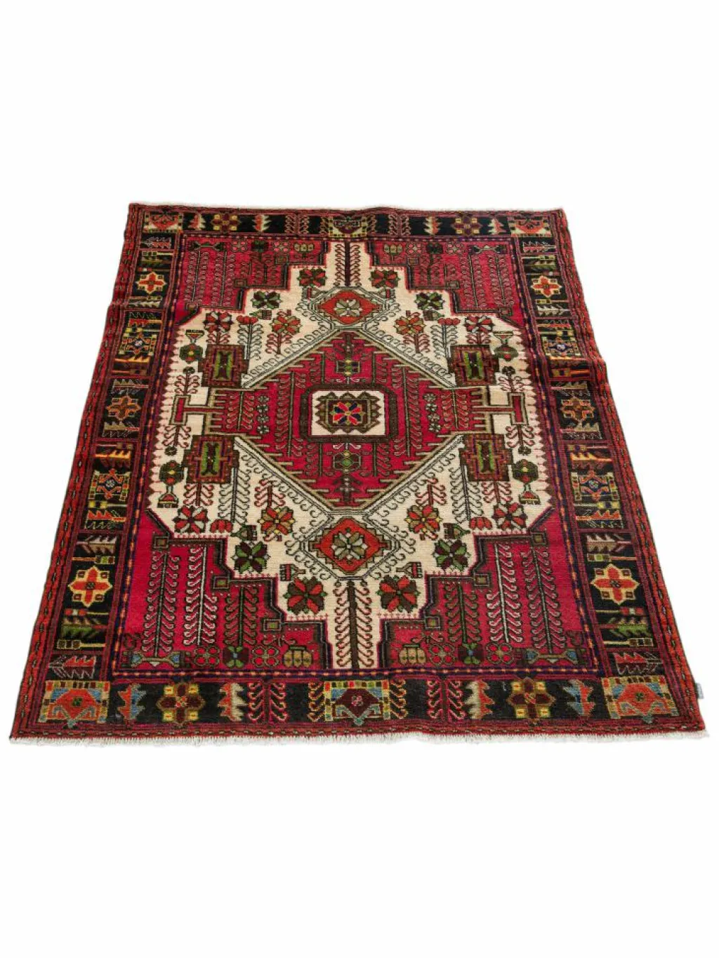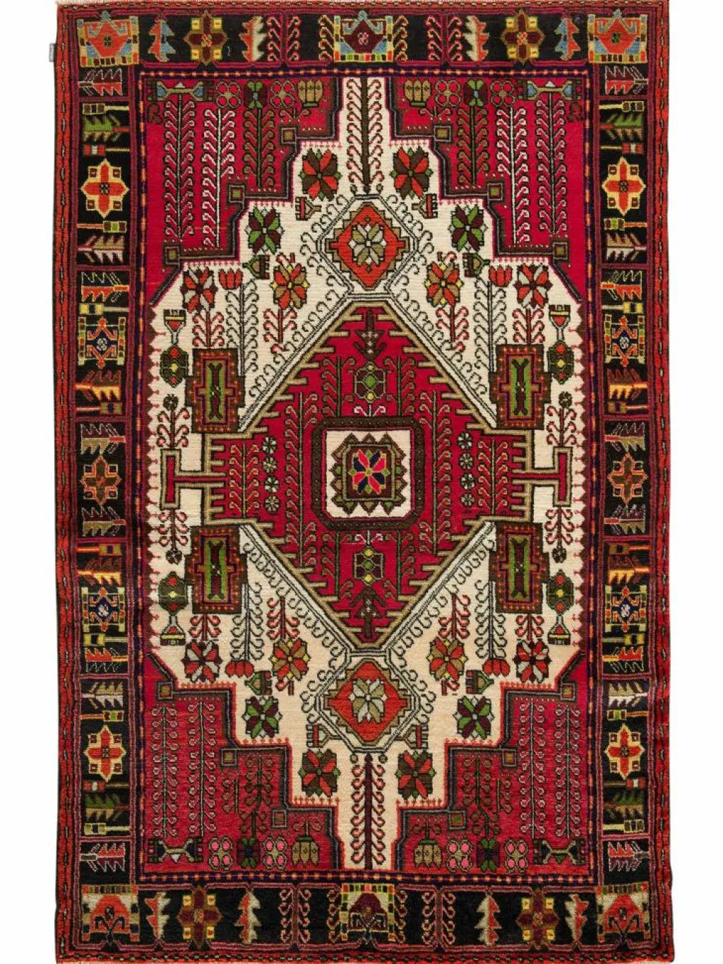 gehört zu den ältesten existierenden Städten Persiens. Der Flor ist relativ hoch und weich. Blüten, Blätter, Zweige und Vasen gruppieren sich in stark stilisierter Form um ein Mittelmedaillon.Die Gegend umHamadan