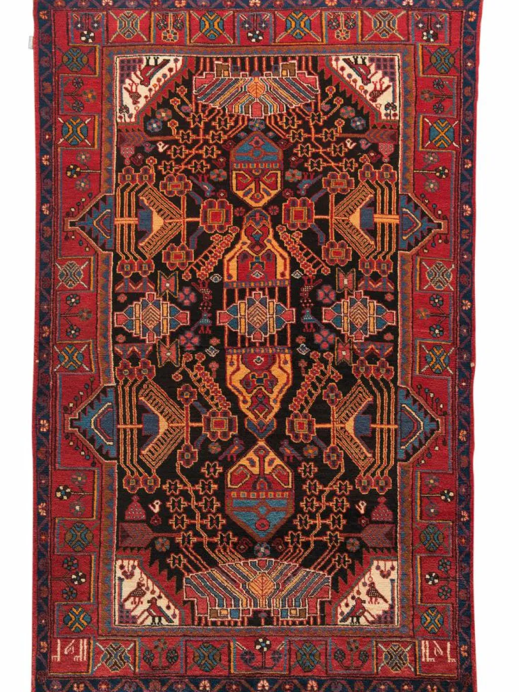 gehört zu den ältesten existierenden Städten Persiens. Der Flor ist relativ hoch und weich. Blüten, Blätter, Zweige und Vasen gruppieren sich in stark stilisierter Form um ein Mittelmedaillon.Die Gegend umHamadan