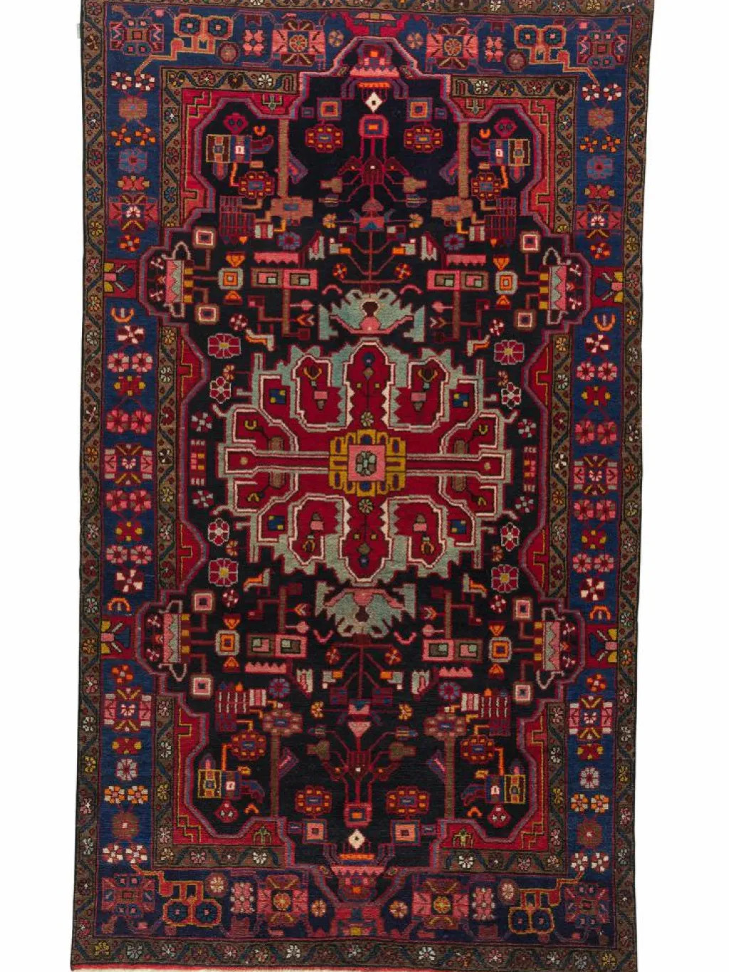 gehört zu den ältesten existierenden Städten Persiens. Der Flor ist relativ hoch und weich. Blüten, Blätter, Zweige und Vasen gruppieren sich in stark stilisierter Form um ein Mittelmedaillon.Die Gegend umHamadan