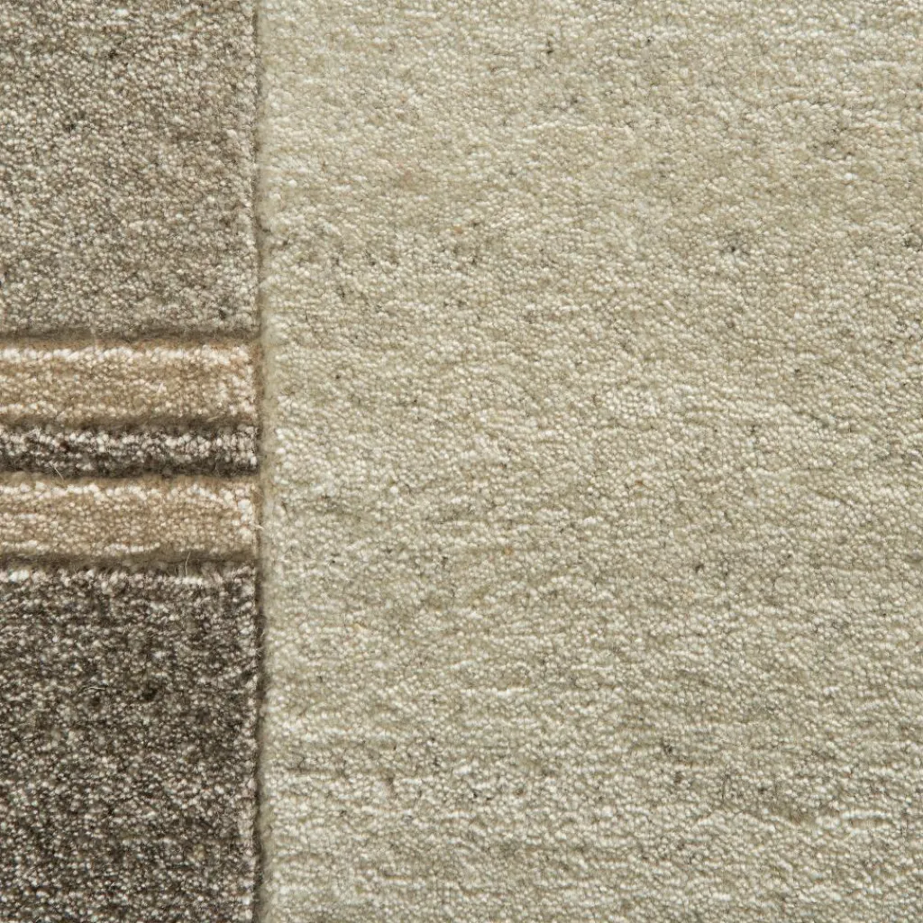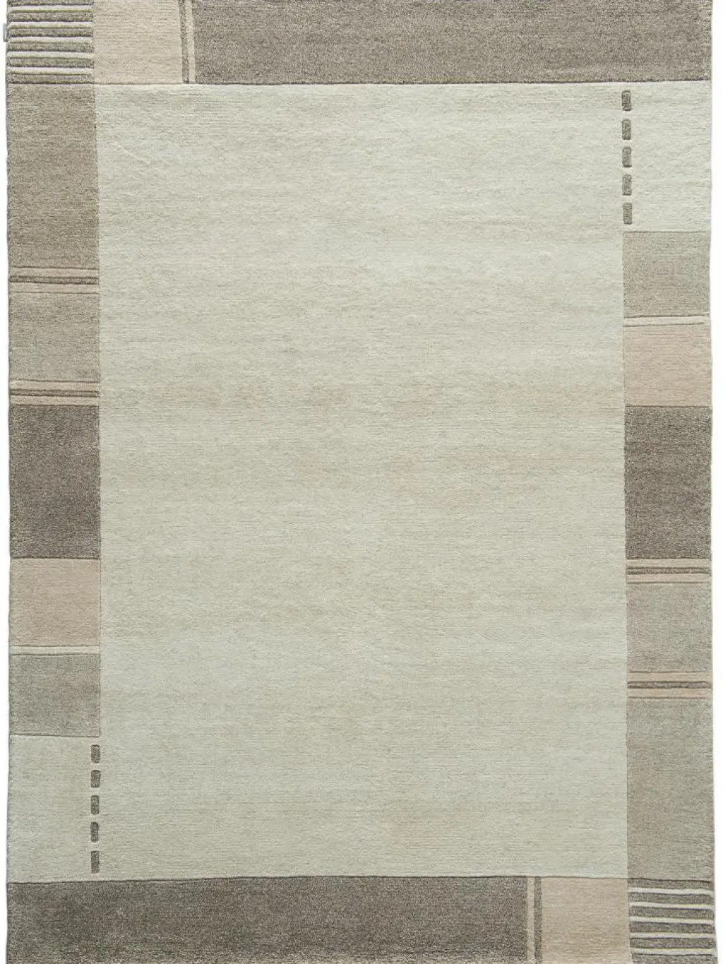 im Flor handgeknüpft. Die Trennung zwischen den Mustern ist akurat ausgearbeitet und von Hand konturgeschnitten. In der Einfassung wurde zur Verstärkung ein Kettfaden eingenäht und anschließend mit farblich passendem Garn ummantelt.| Art: | Nepal -Teppich |