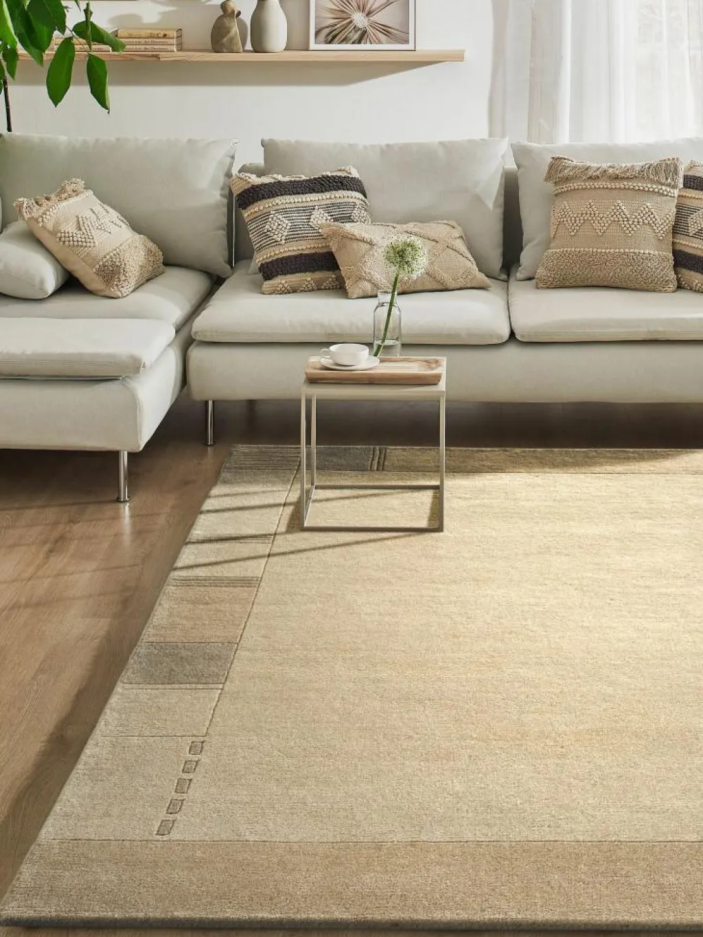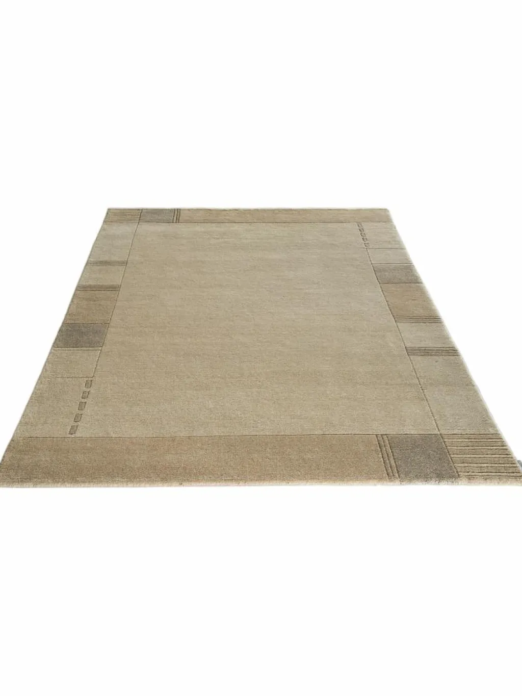 im Flor handgeknüpft. Die Trennung zwischen den Mustern ist akurat ausgearbeitet und von Hand konturgeschnitten. In der Einfassung wurde zur Verstärkung ein Kettfaden eingenäht und anschließend mit farblich passendem Garn ummantelt.| Art: | Nepal -Teppich |
