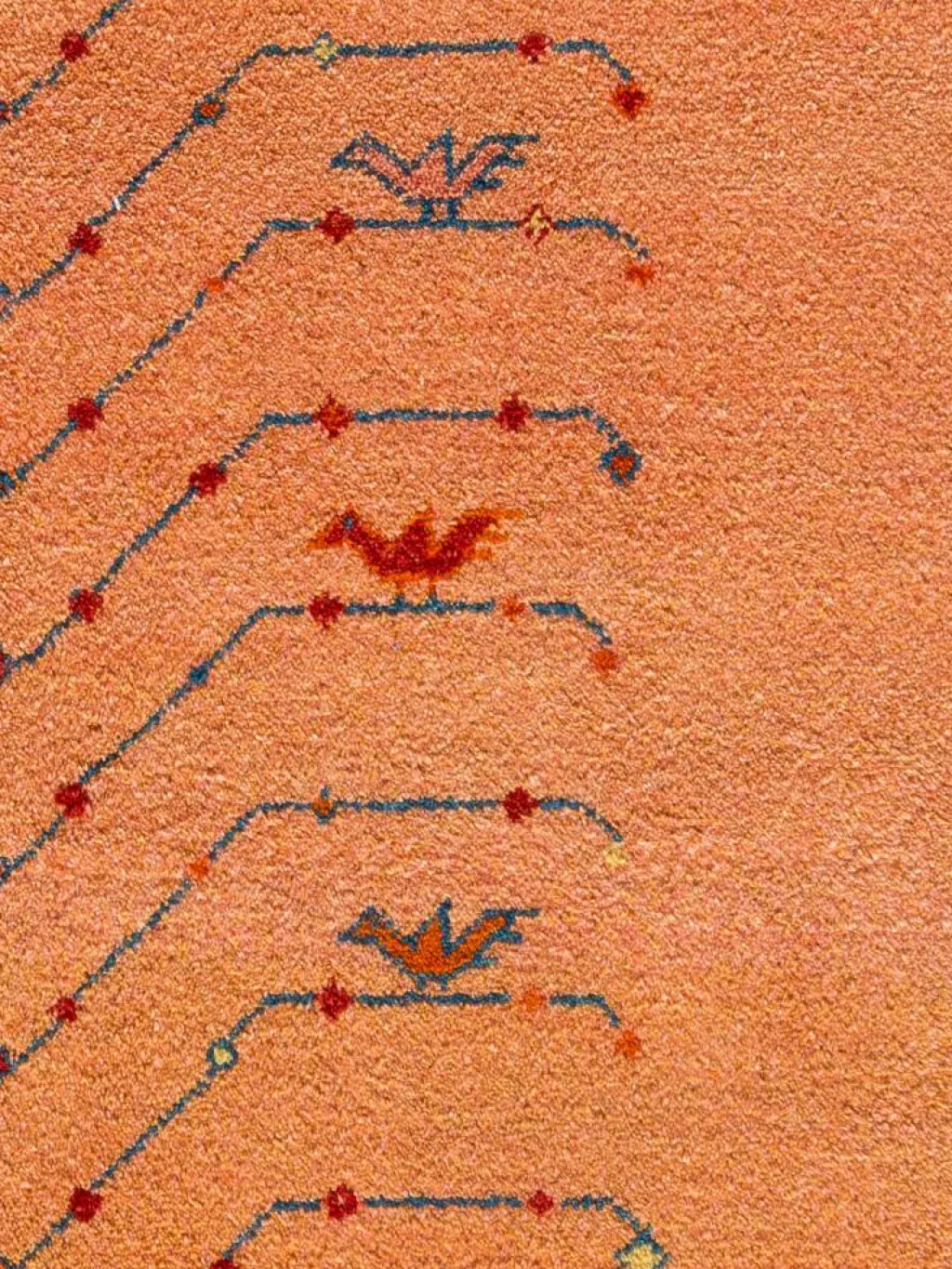 . Die Schur ist relativ hoch, der Griff fest. Die Muster sind meist schlicht oder eine Kombination mit traditionellen Mustern. Mustervorlagen gibt es nicht. Geknüpft werden alle Muster aus dem Kopf.| Gesamthöhe: | ca. 18 mm |