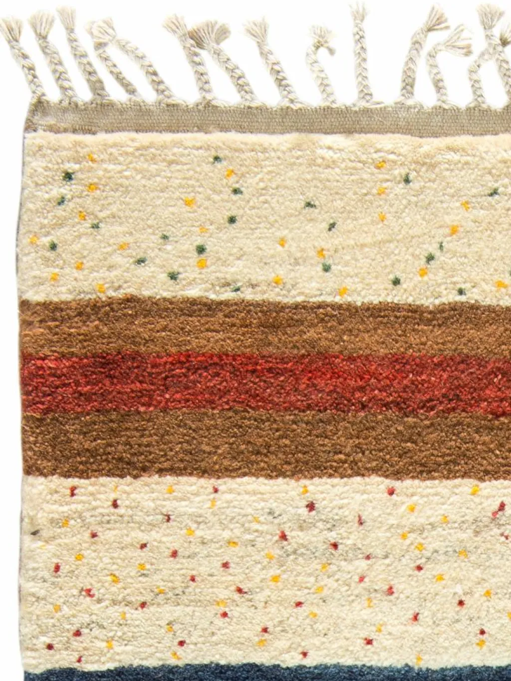 . Die Schur ist relativ hoch, der Griff fest. Die Muster sind meist schlicht oder eine Kombination mit traditionellen Mustern. Mustervorlagen gibt es nicht. Geknüpft werden alle Muster aus dem Kopf.| Gesamthöhe: | ca. 18 mm |