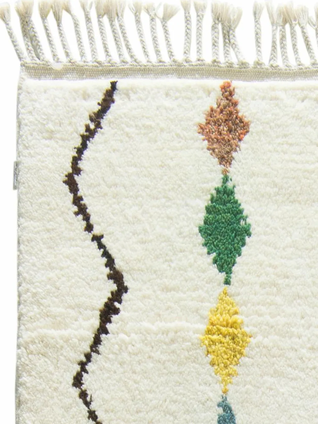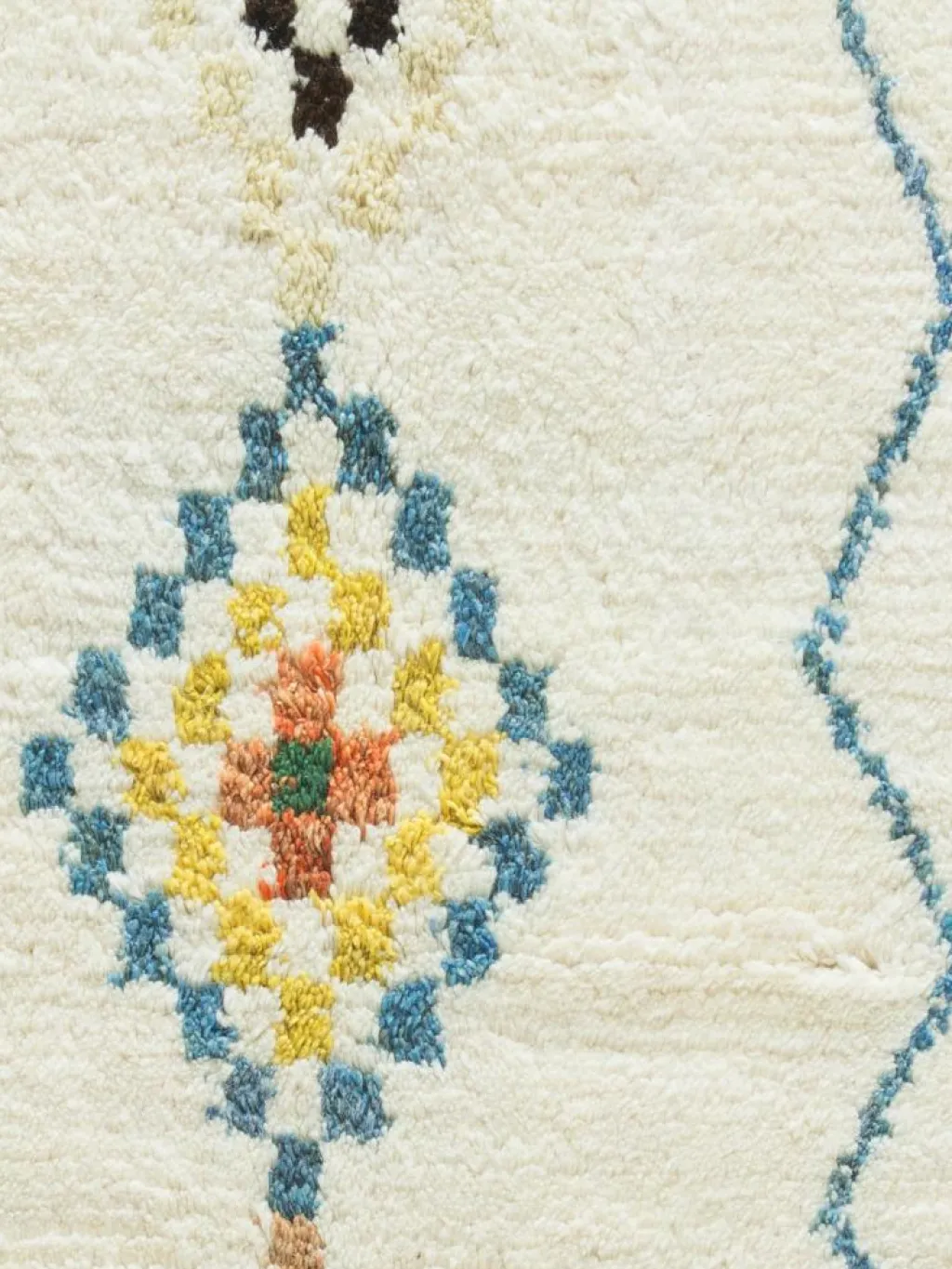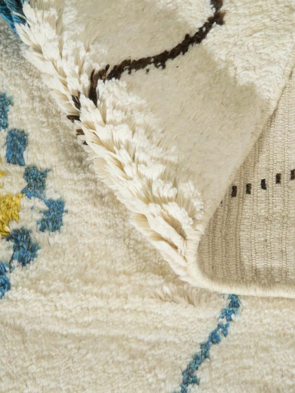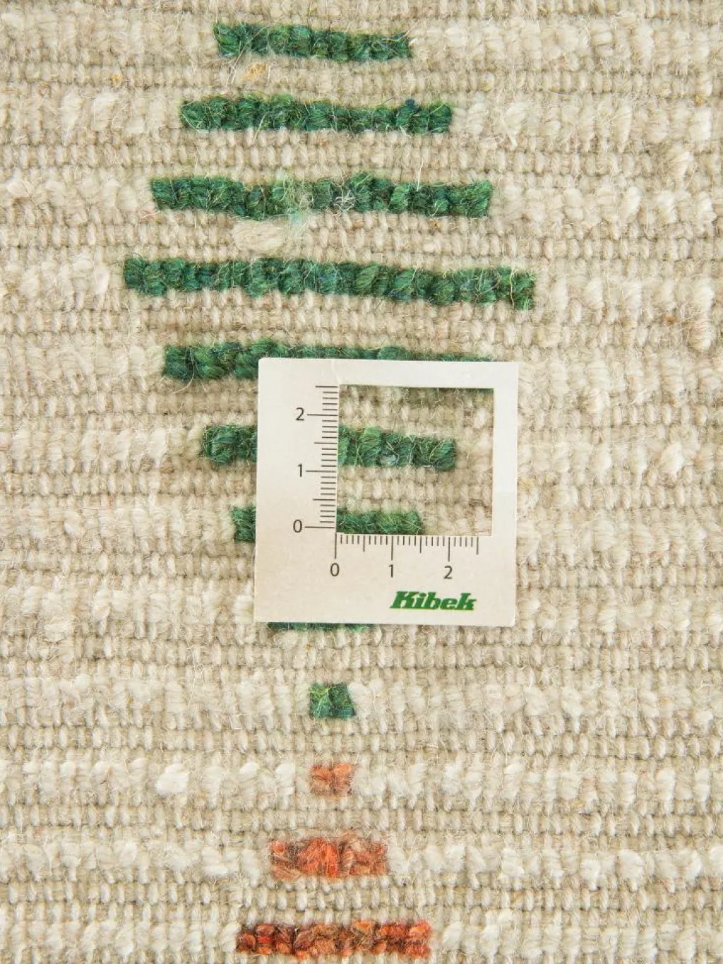 . Die Schur ist relativ hoch, der Griff fest. Die Muster sind meist schlicht oder eine Kombination mit traditionellen Mustern. Mustervorlagen gibt es nicht. Geknüpft werden alle Muster aus dem Kopf.| Gesamthöhe: | ca. 18 mm |