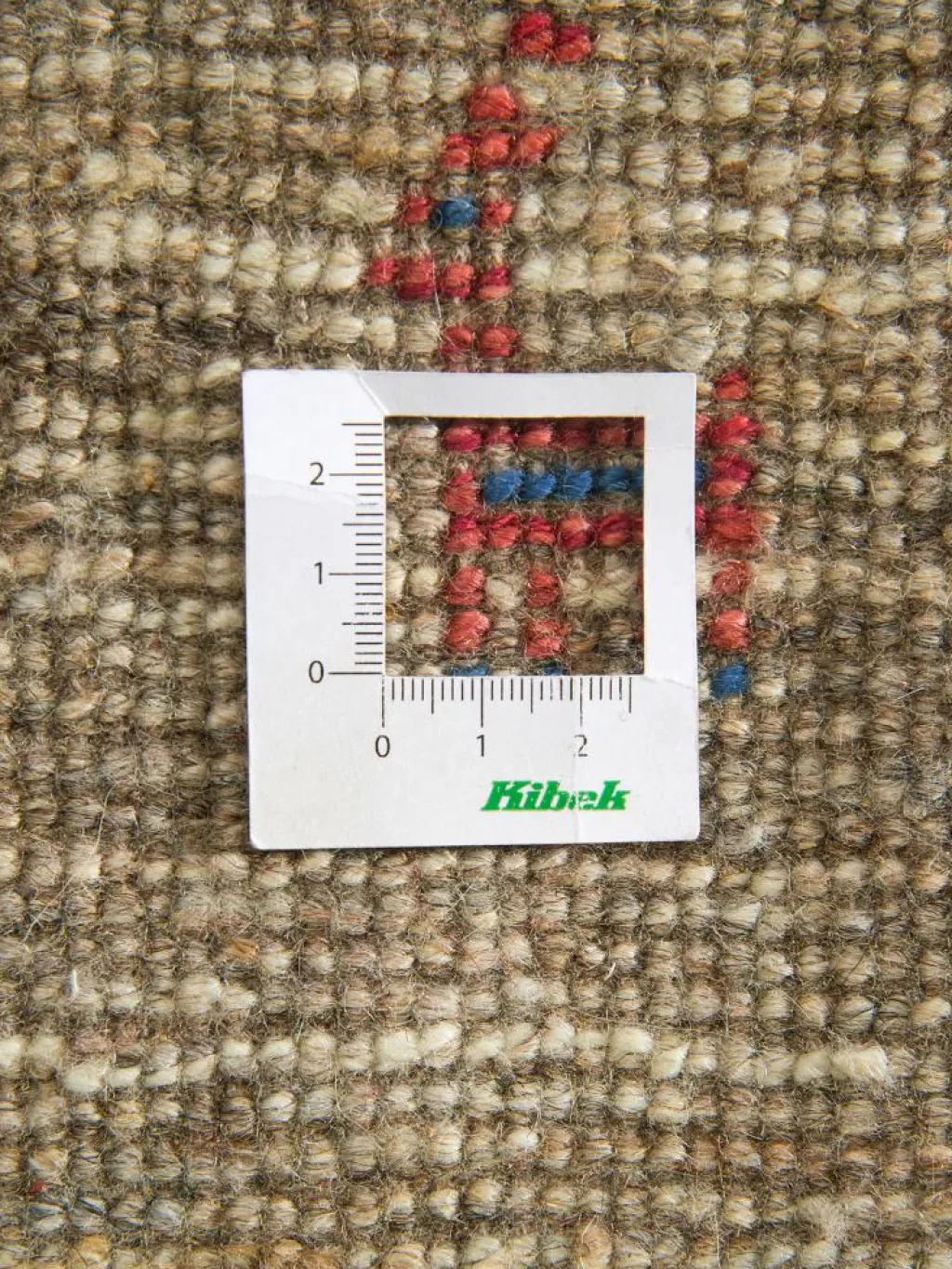 . Die Schur ist relativ hoch, der Griff fest. Die Muster sind meist schlicht oder eine Kombination mit traditionellen Mustern. Mustervorlagen gibt es nicht. Geknüpft werden alle Muster aus dem Kopf.| Gesamthöhe: | ca. 18 mm |