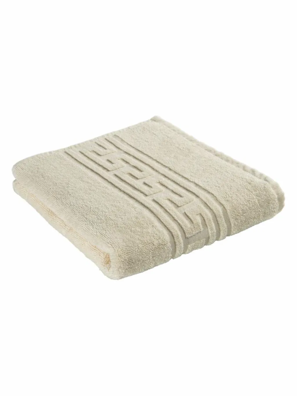 ist eingewebt und im dezent klassischen Muster gehalten. Die Abschlüsse sind sorgfältig von Hand genäht und der Aufhänger besteht aus einer stabilen Kordel. Die Seiten sind doppelt vernäht. Das sehr saugstarke Frottier-Handtuch trocknet ausgesprochen leicht, die hochwertige Baumwolle gibt der Oberfläche einen samtigen Charakter. Alle Farben sind bis 60°C waschbar. Das RECIFE ROYAL ist äußerst robust und daher auch für den Wäschetrockner geeignet. Oeko-Tex Standard 100.| Farbe: | Creme |