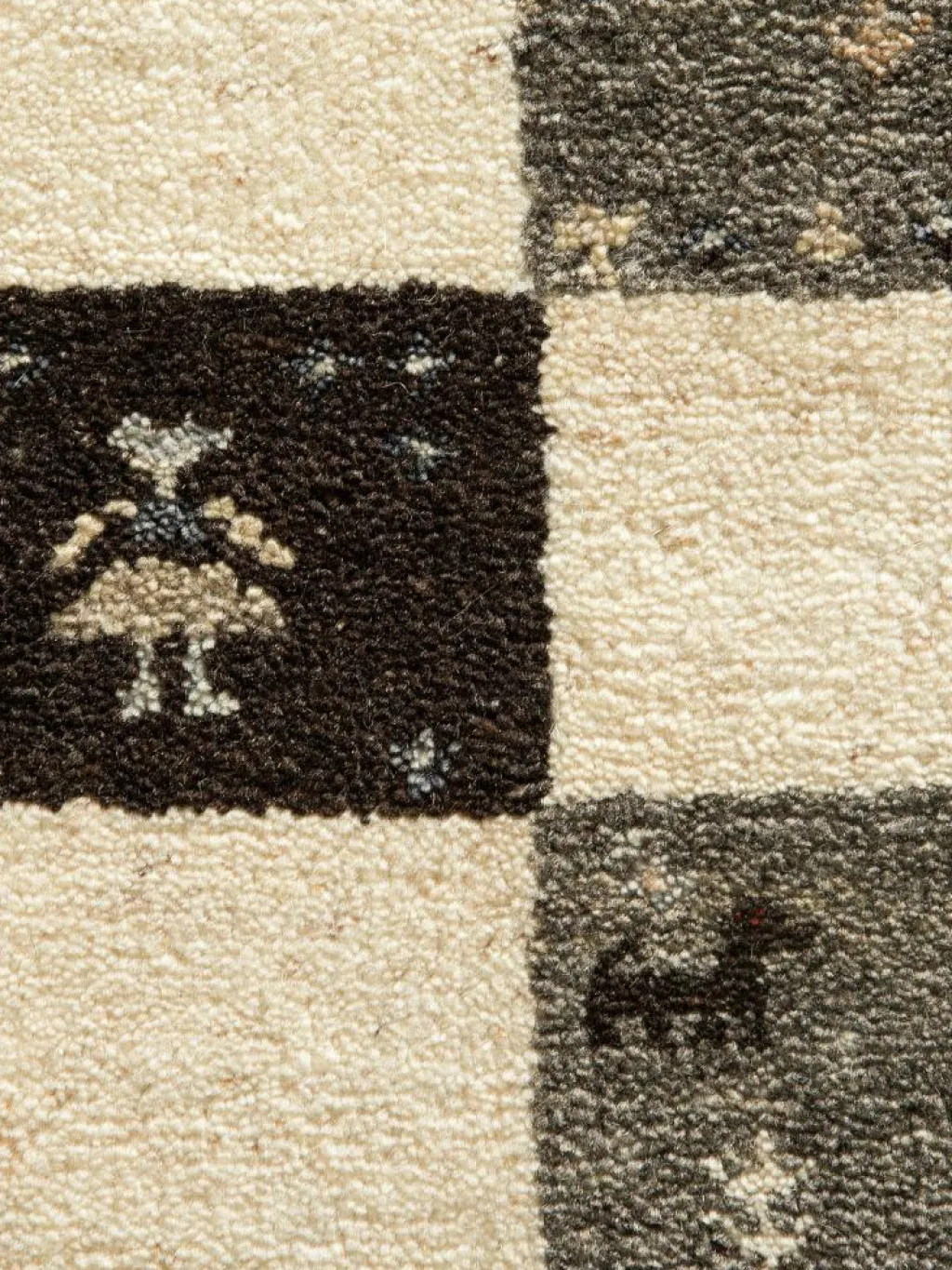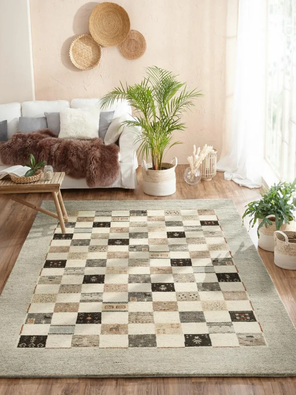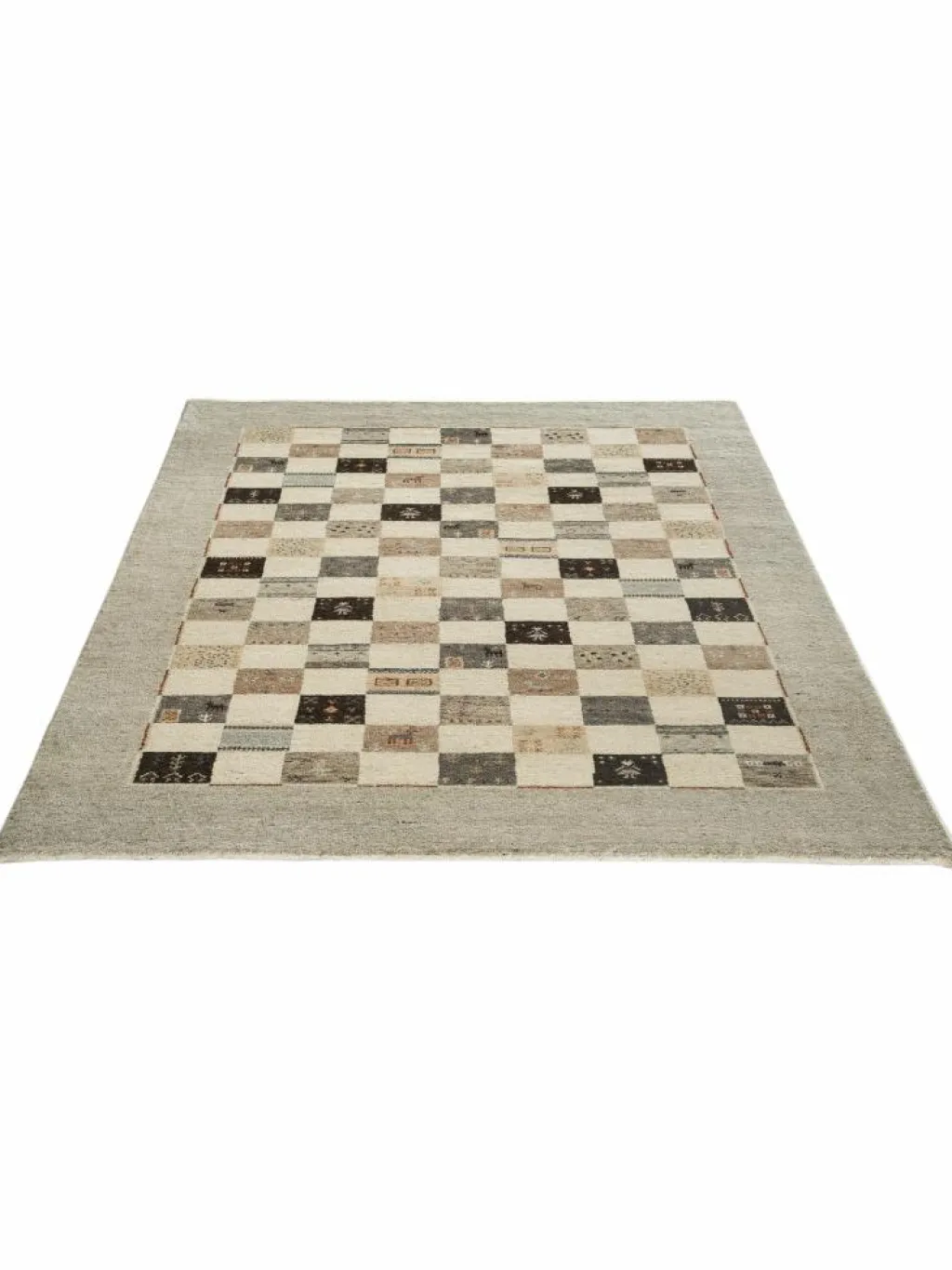 -Teppich ein ganz besonderes Gefühl im Raum aus. Herausstechen tut er zudem mit seinem tollen Schachbrettmuster, welches sich aus verschiedenen, natürlichen Farben zusammensetzt. Hergestellt aus 100 % ungefärbterSchurwolle