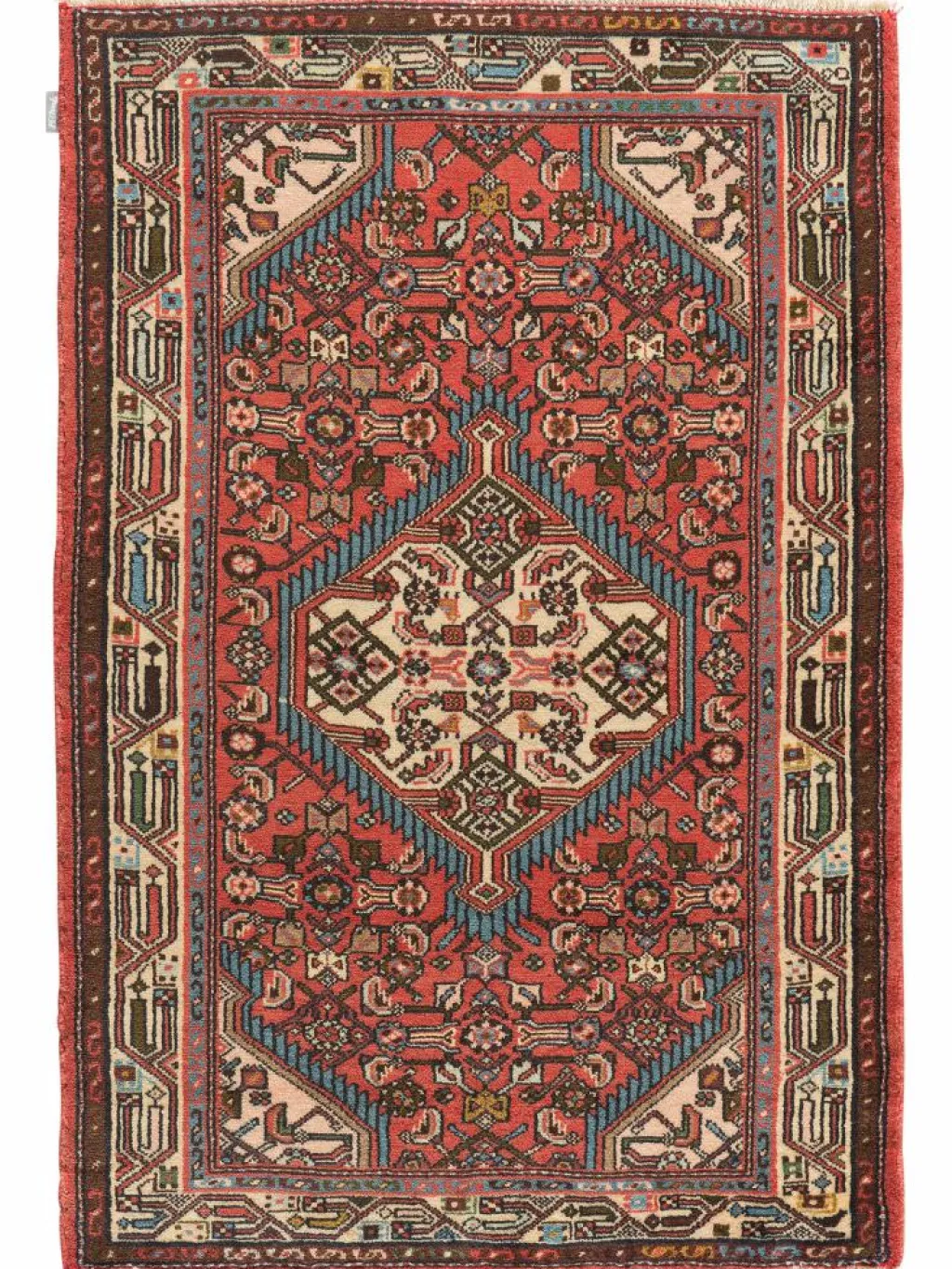 . Die Farben des Teppichs sind warm. Die Muster sind charakteristisch: Das Innenfeld ist mit einemMahi