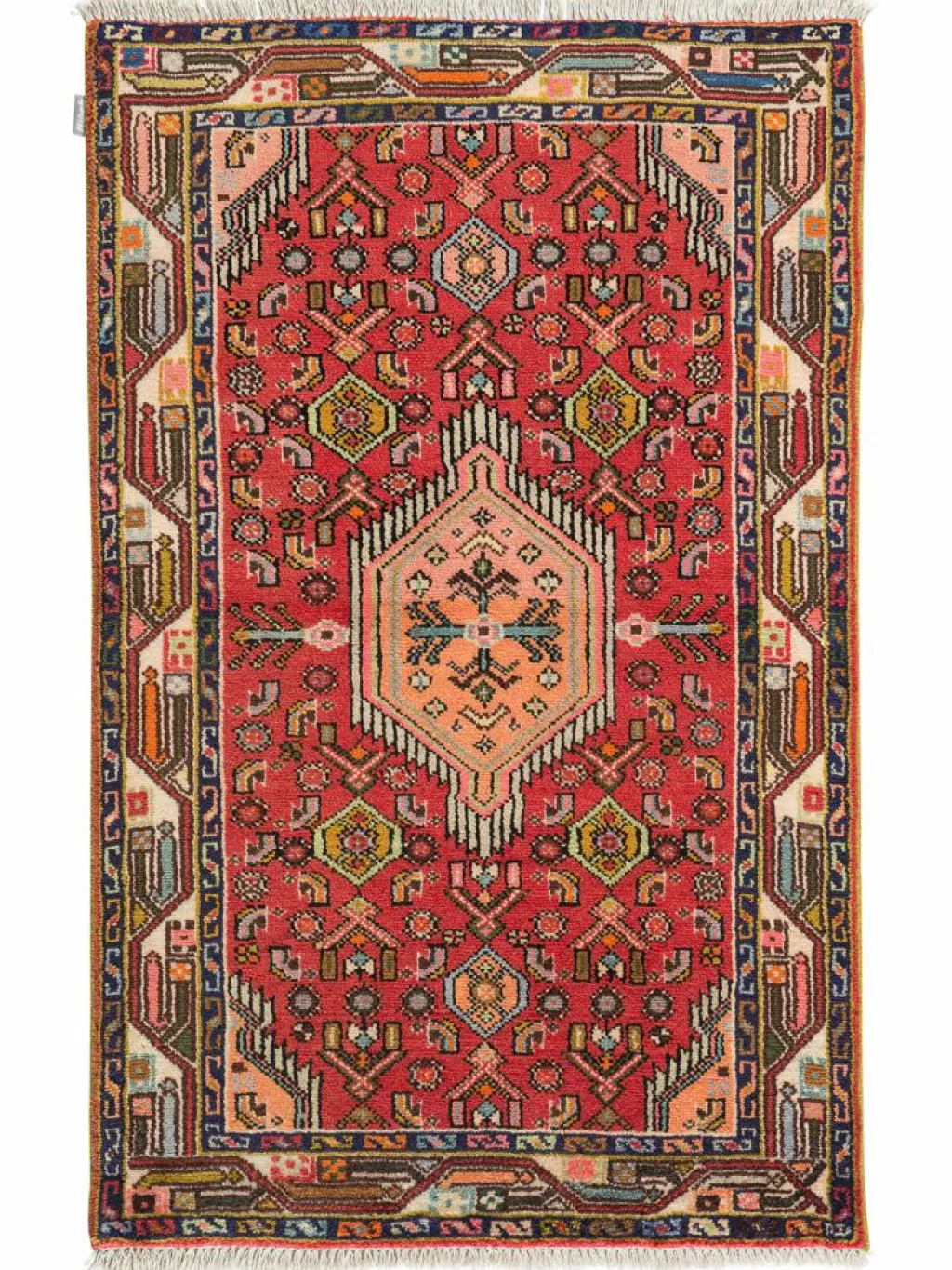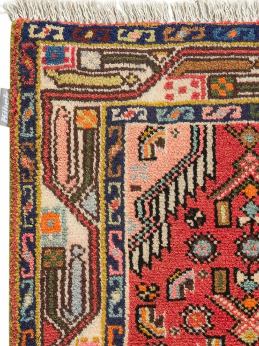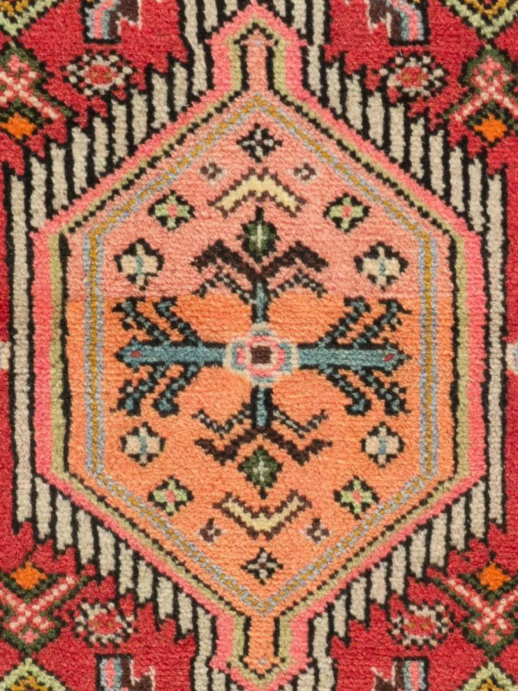 . Die Farben des Teppichs sind warm. Die Muster sind charakteristisch: Das Innenfeld ist mit einemMahi